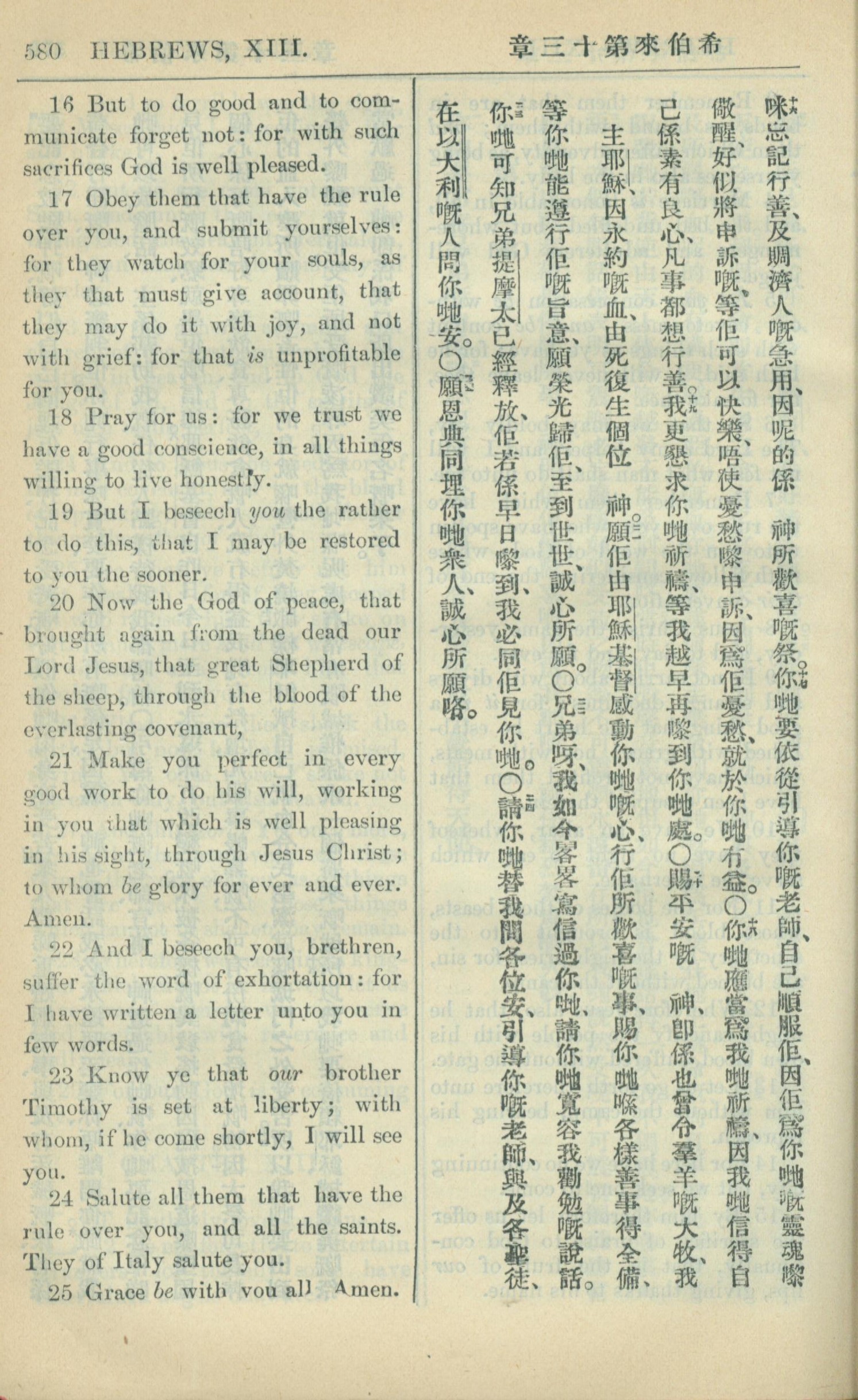 1909年中西字新約全書 希伯來書 13 章 16 節到 13 章 25 節
