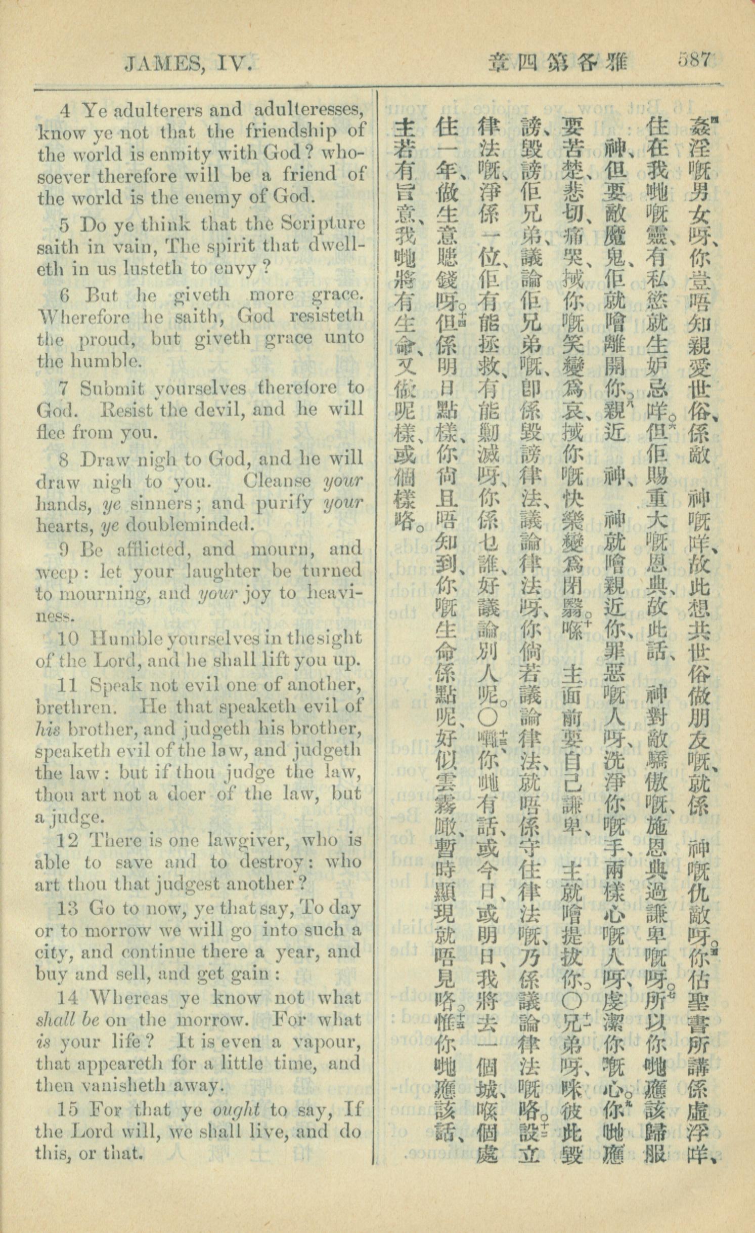 1909年中西字新約全書 雅各書 4 章 4 節到 4 章 15 節