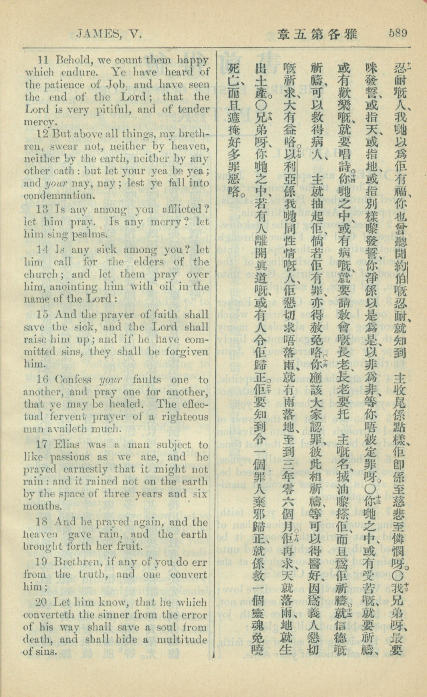 1909年中西字新約全書 雅各書 5 章 11 節到 5 章 20 節
