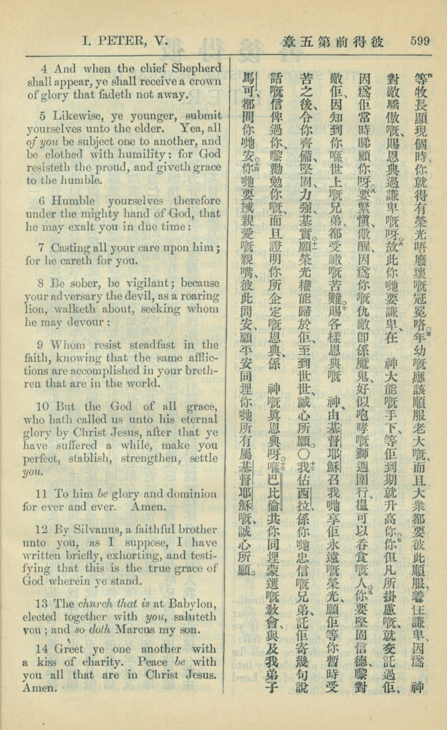 1909年中西字新約全書 彼得前書 5 章 4 節到 5 章 14 節