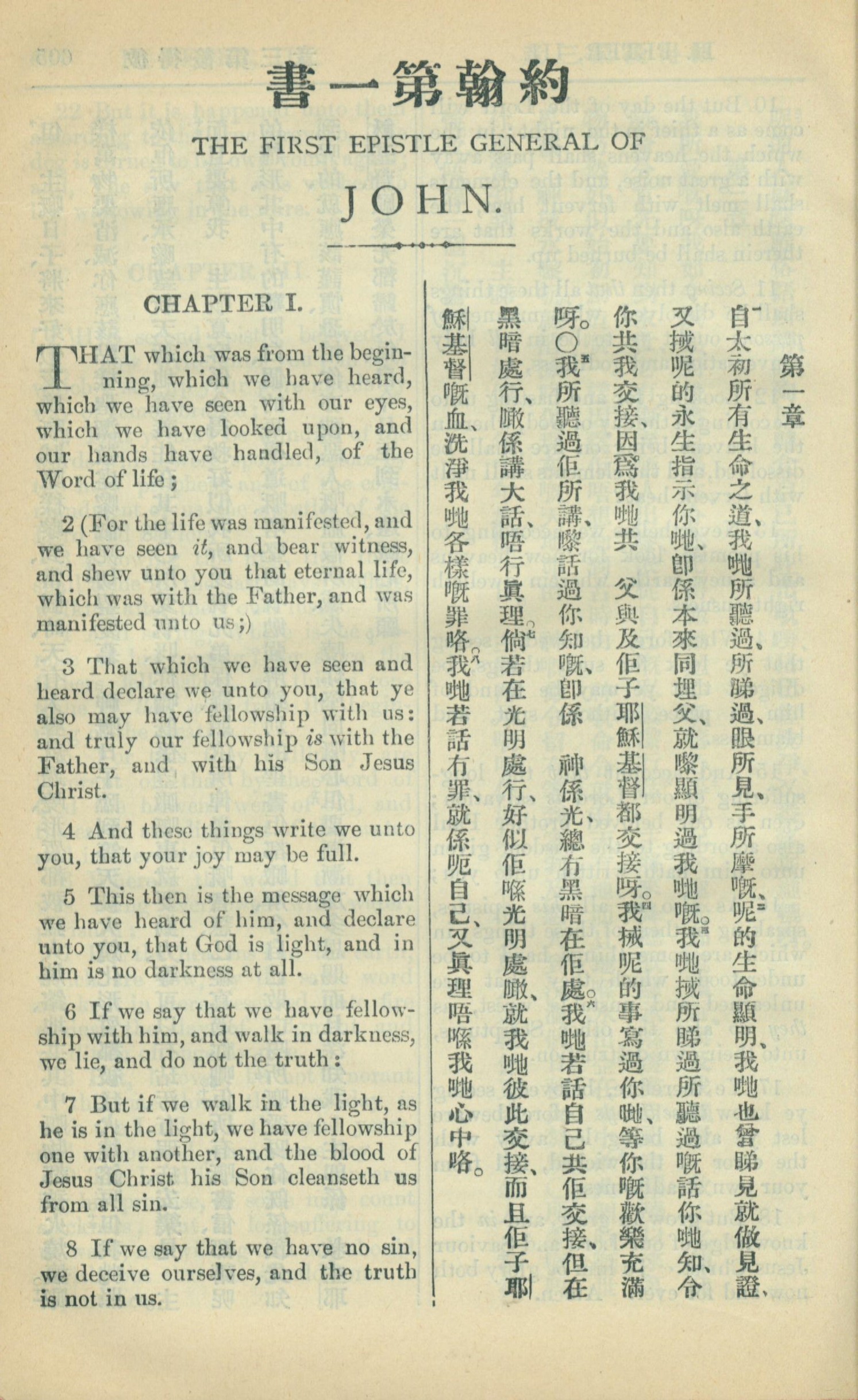 1909年中西字新約全書 約翰一書 1 章 1 節到 1 章 8 節