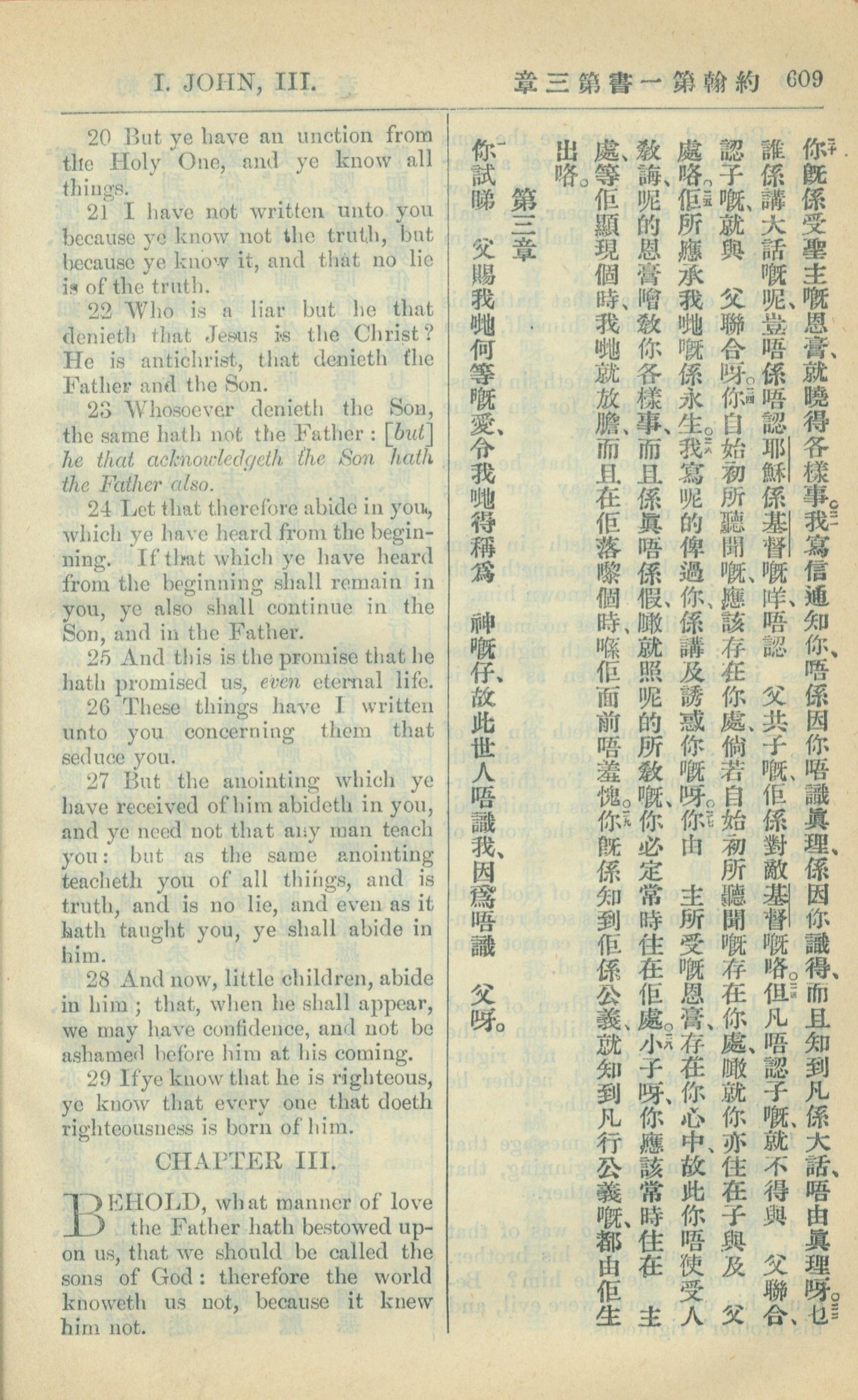 1909年中西字新約全書 約翰一書 2 章 20 節到 3 章 1 節
