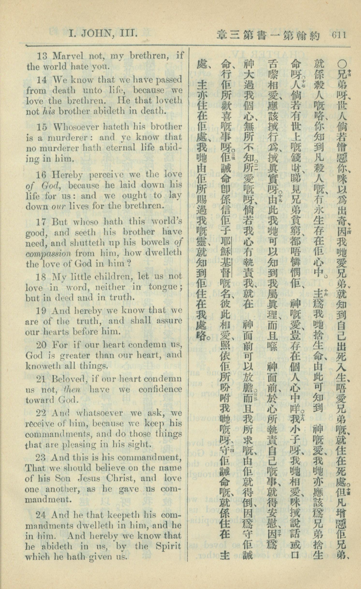 1909年中西字新約全書 約翰一書 3 章 13 節到 3 章 24 節