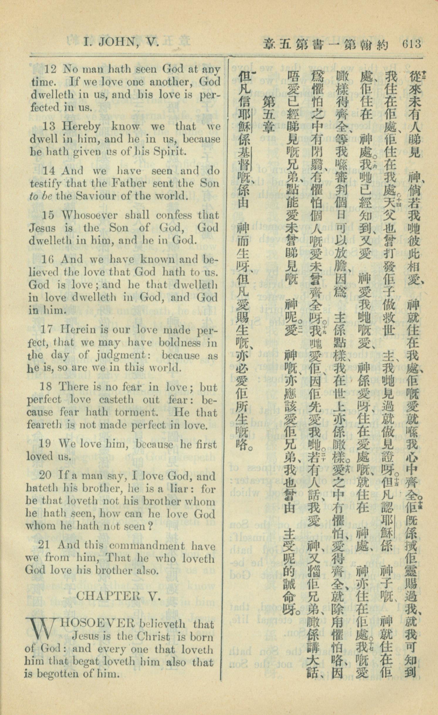 1909年中西字新約全書 約翰一書 4 章 12 節到 5 章 1 節
