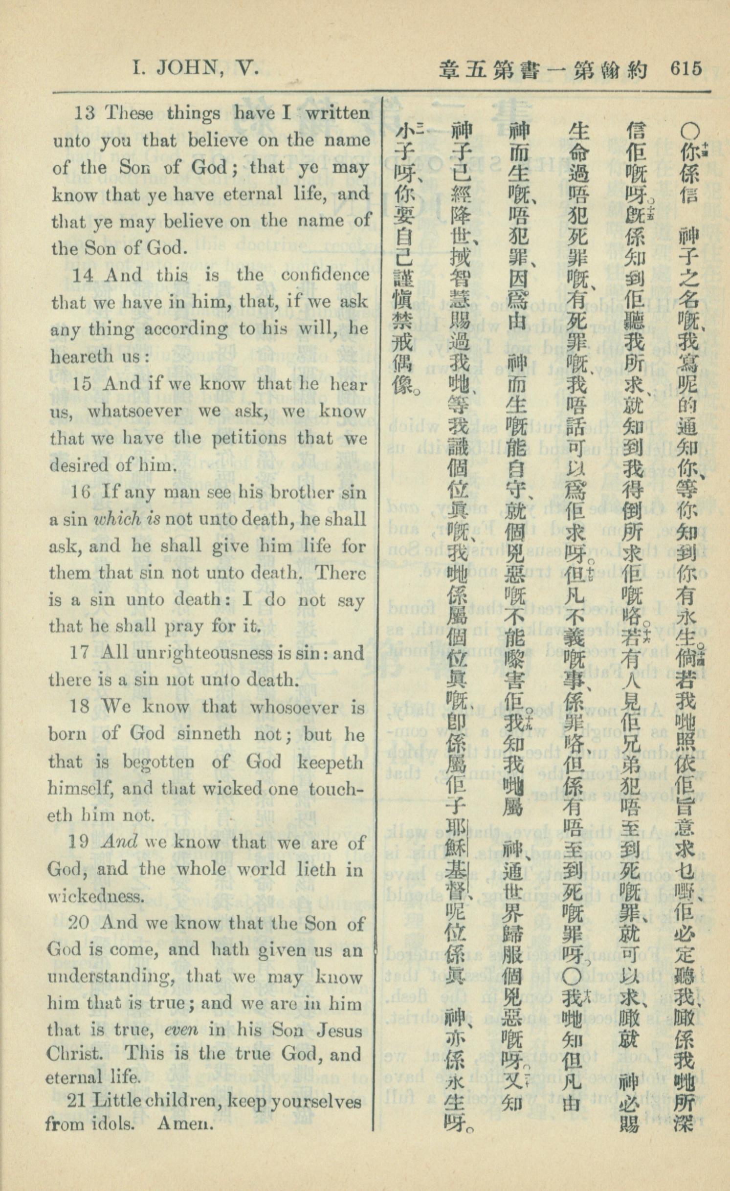 1909年中西字新約全書 約翰一書 5 章 13 節到 5 章 21 節