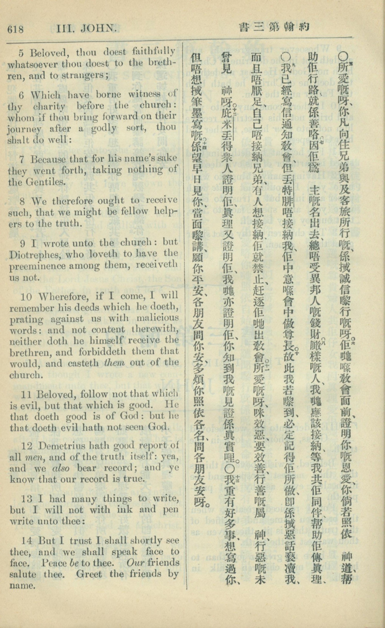 1909年中西字新約全書 約翰三書 1 章 5 節到 1 章 14 節