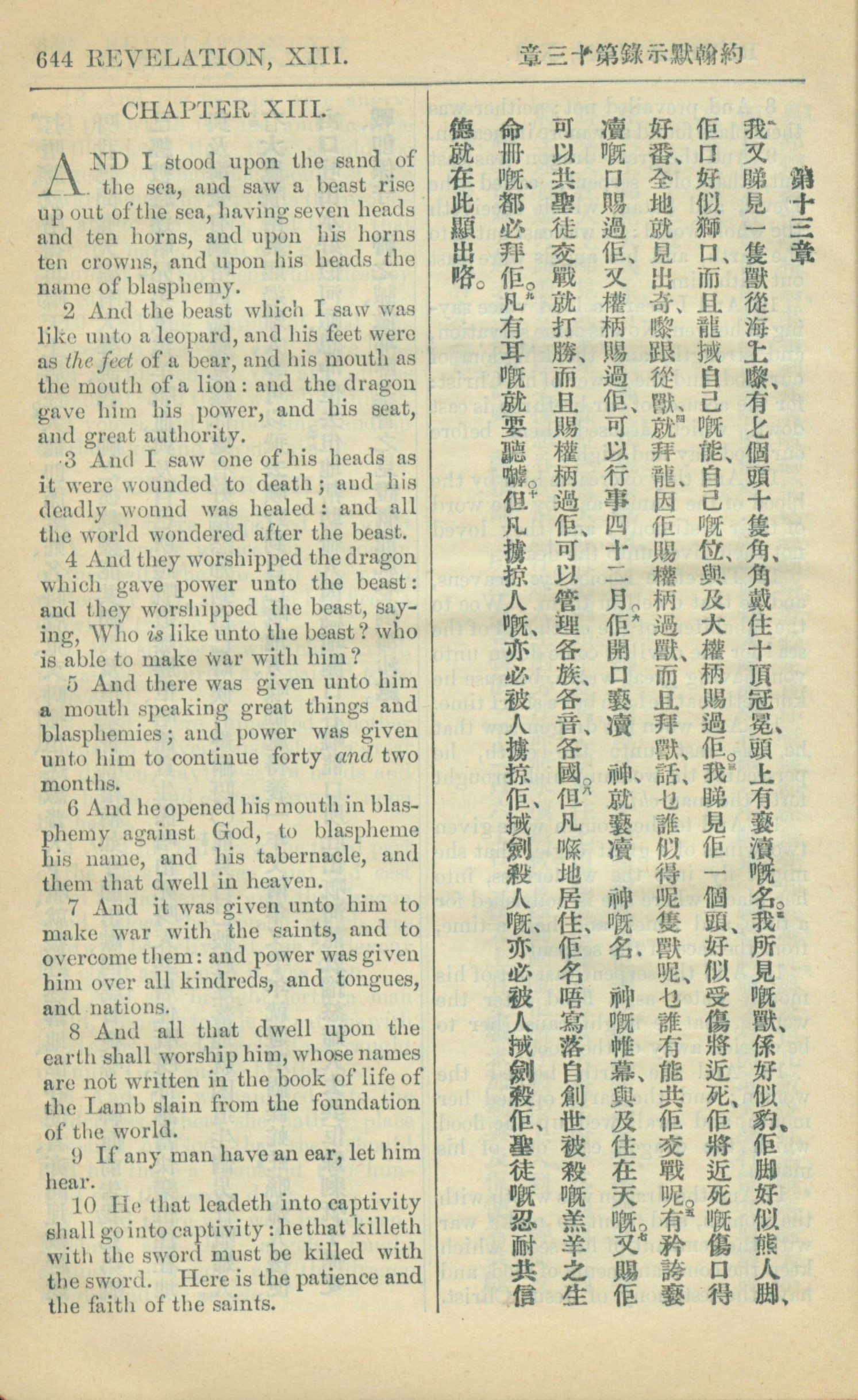 1909年中西字新約全書 啟示錄 13 章 1 節到 13 章 10 節