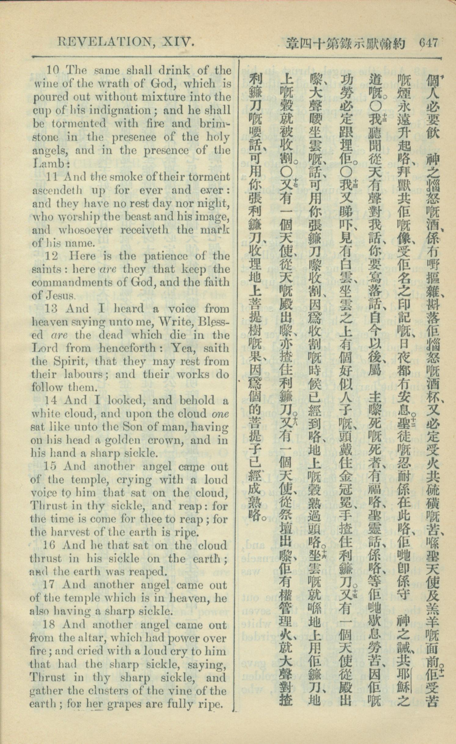 1909年中西字新約全書 啟示錄 14 章 10 節到 14 章 18 節