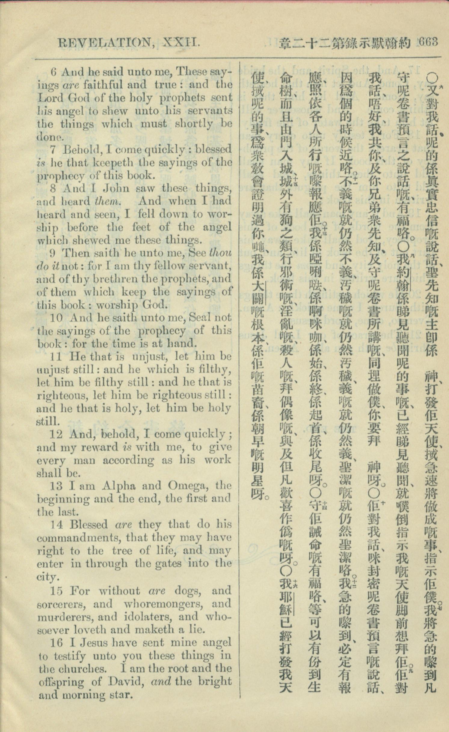 1909年中西字新約全書 啟示錄 22 章 6 節到 22 章 16 節