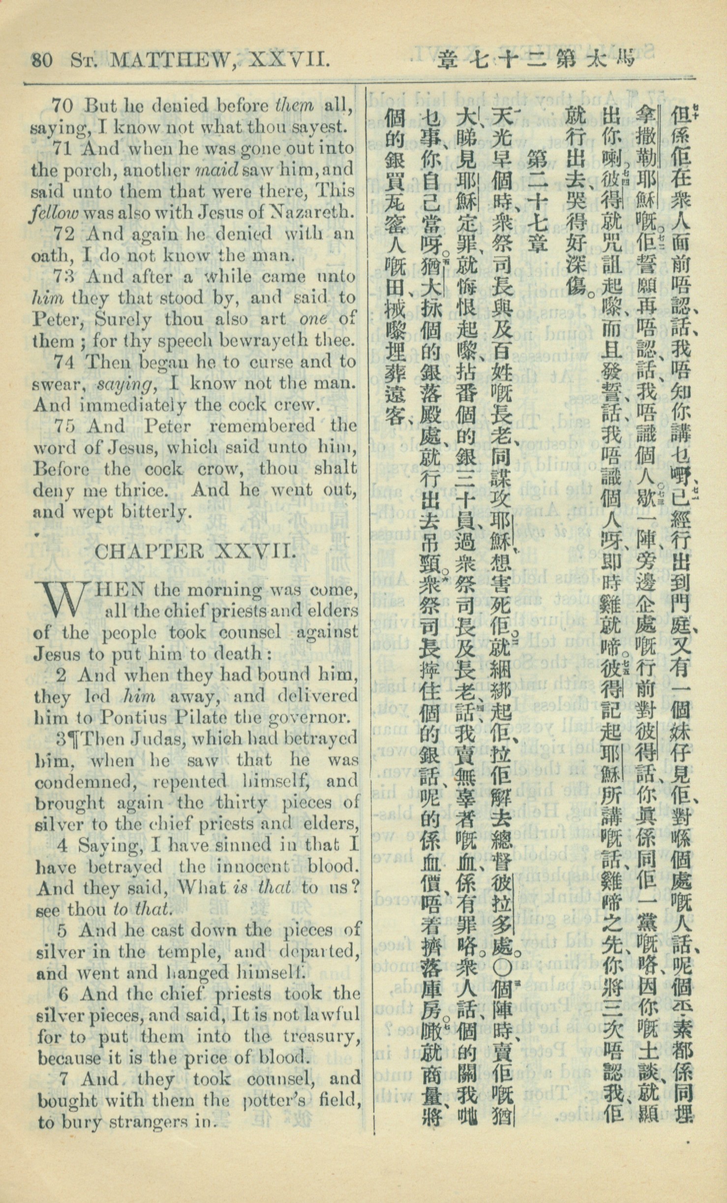 1909年中西字新約全書 馬太福音 26 章 70 節到 27 章 7 節