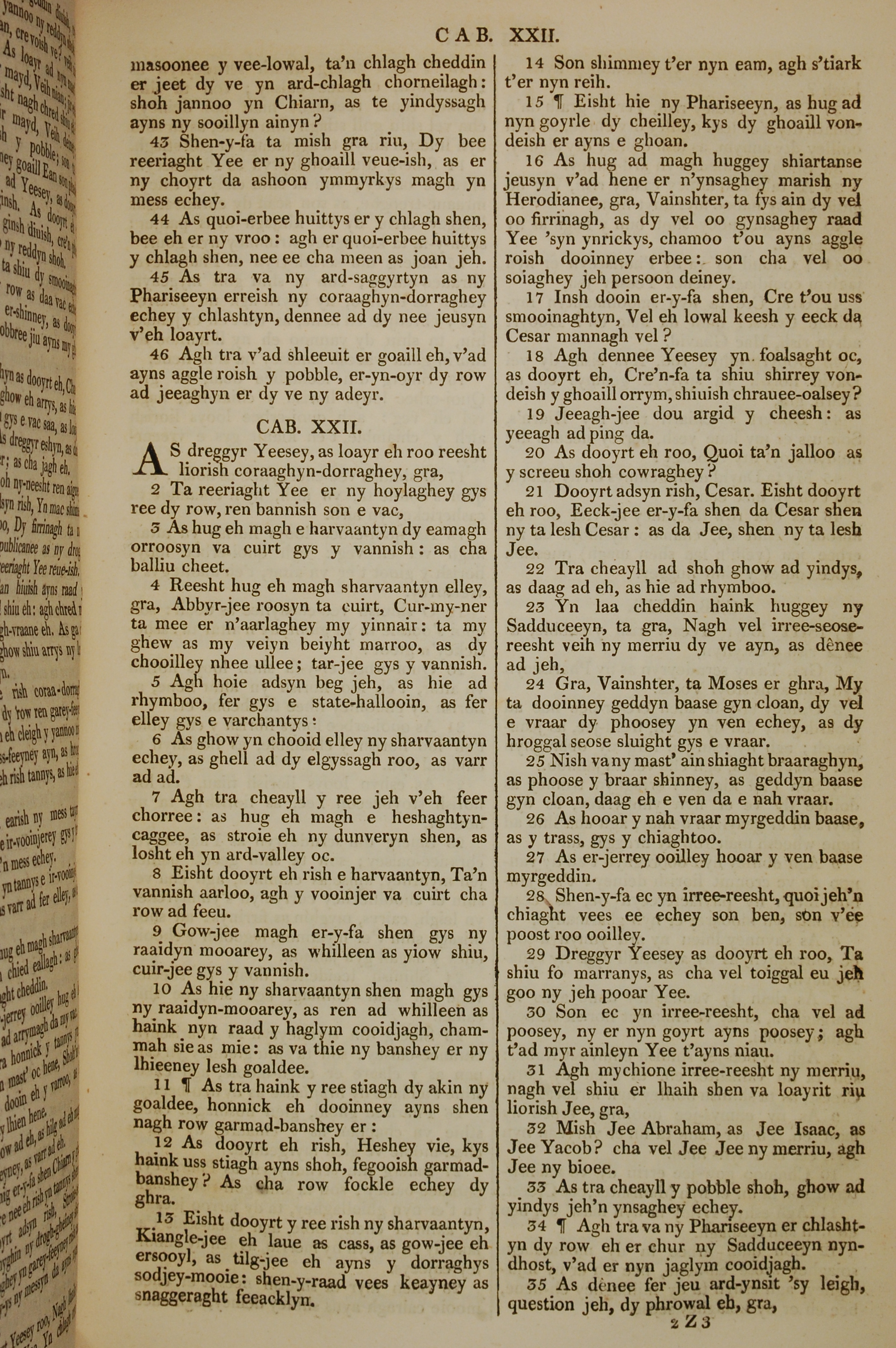 1819年曼島語聖經 馬太福音 21 章 43 節到 22 章 35 節