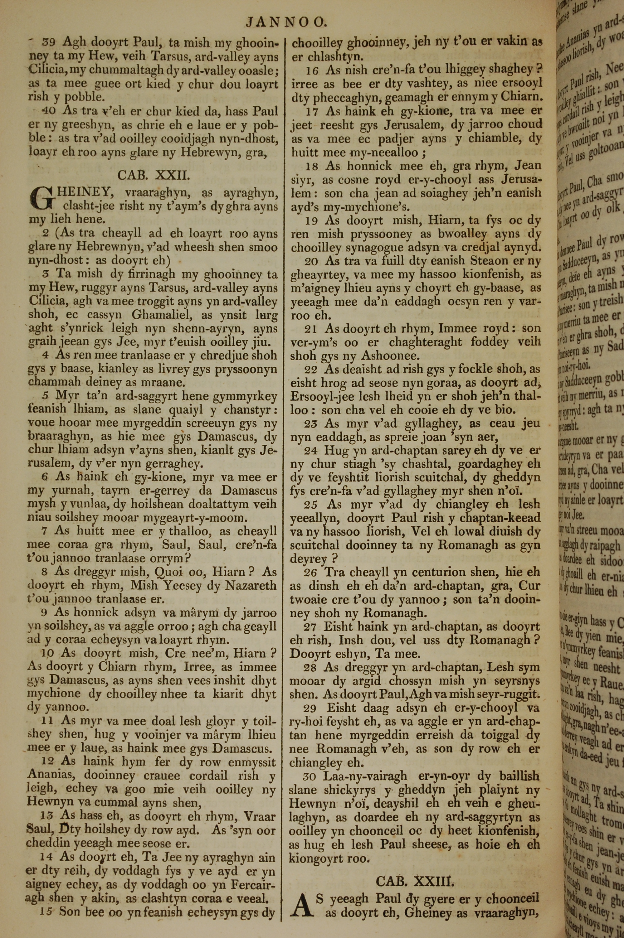 1819年曼島語聖經 使徒行傳 21 章 39 節到 23 章 1 節