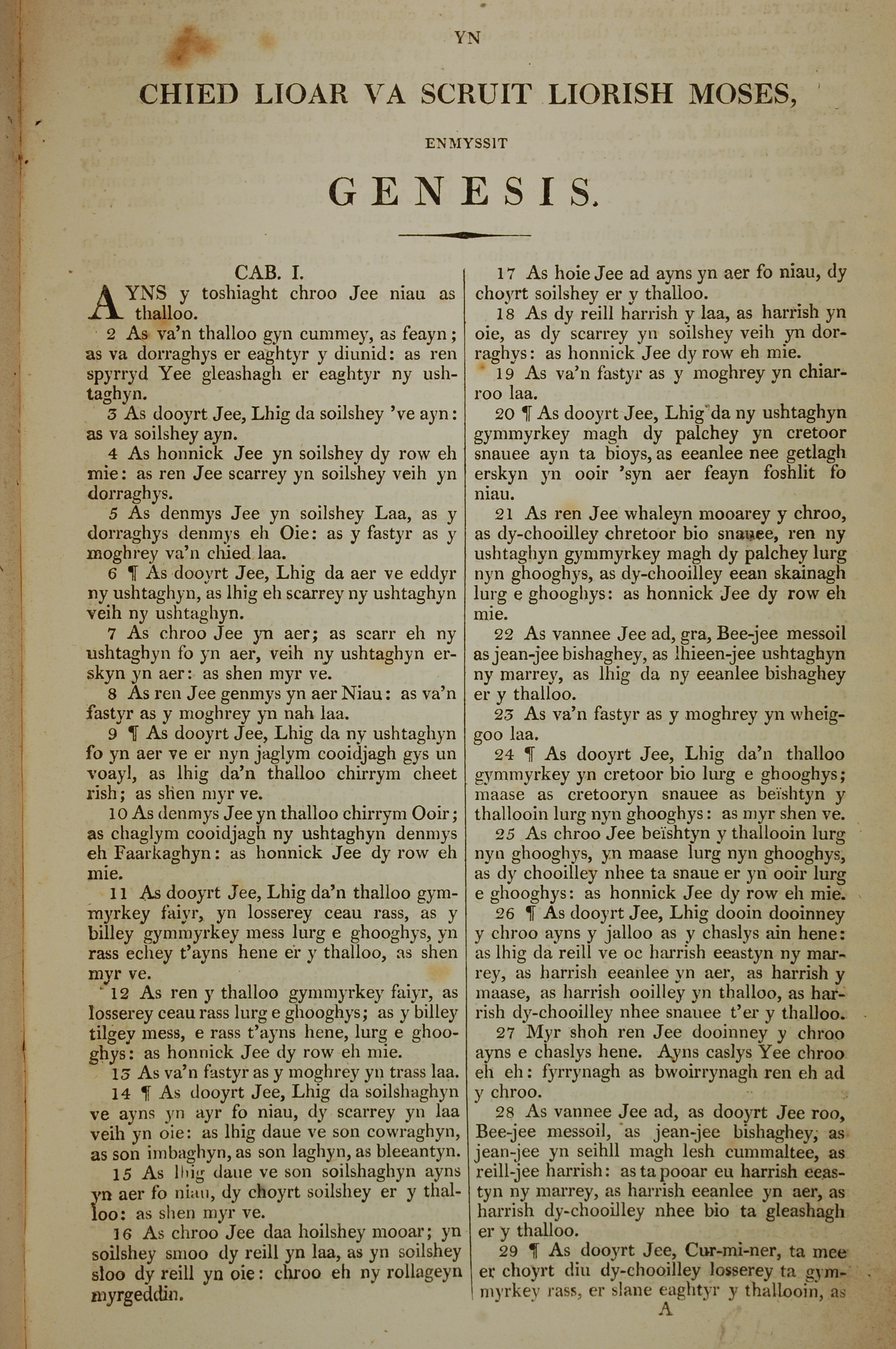 1819年曼島語聖經 創世記 1 章 1 節到 1 章 29 節