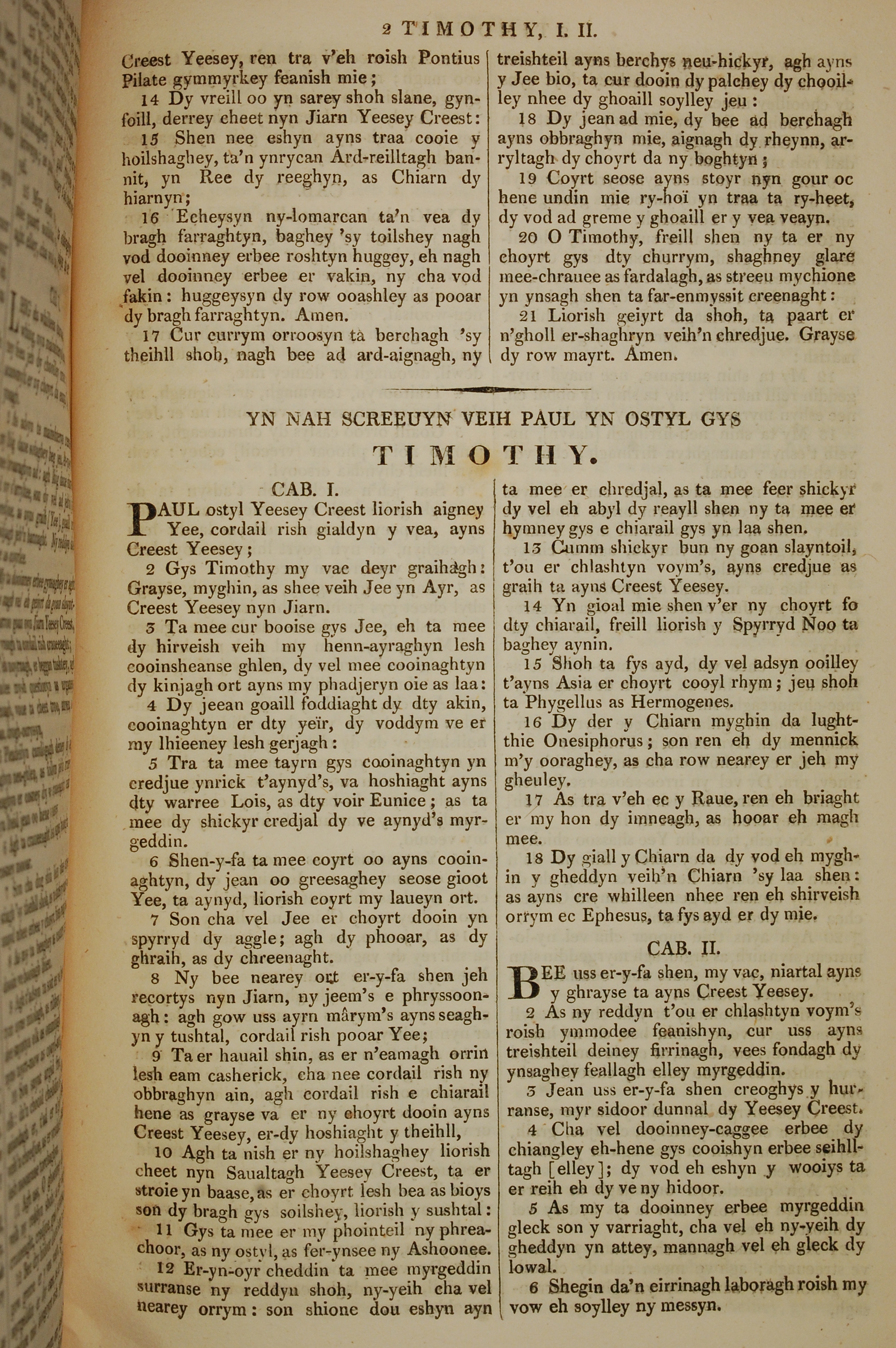 1819年曼島語聖經 提摩太後書 1 章 1 節到 2 章 6 節