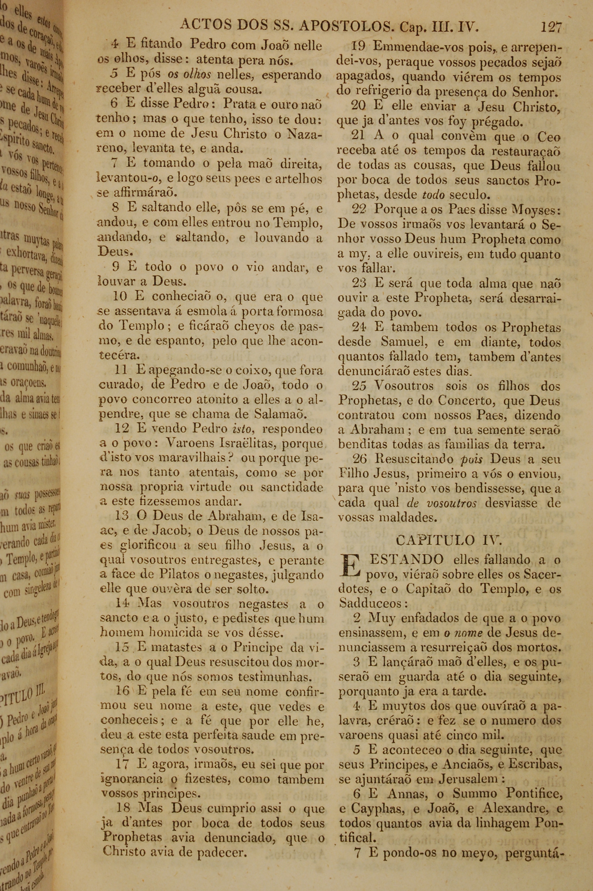 1819年葡萄牙語新約全書 使徒行傳 3 章 4 節到 4 章 7 節