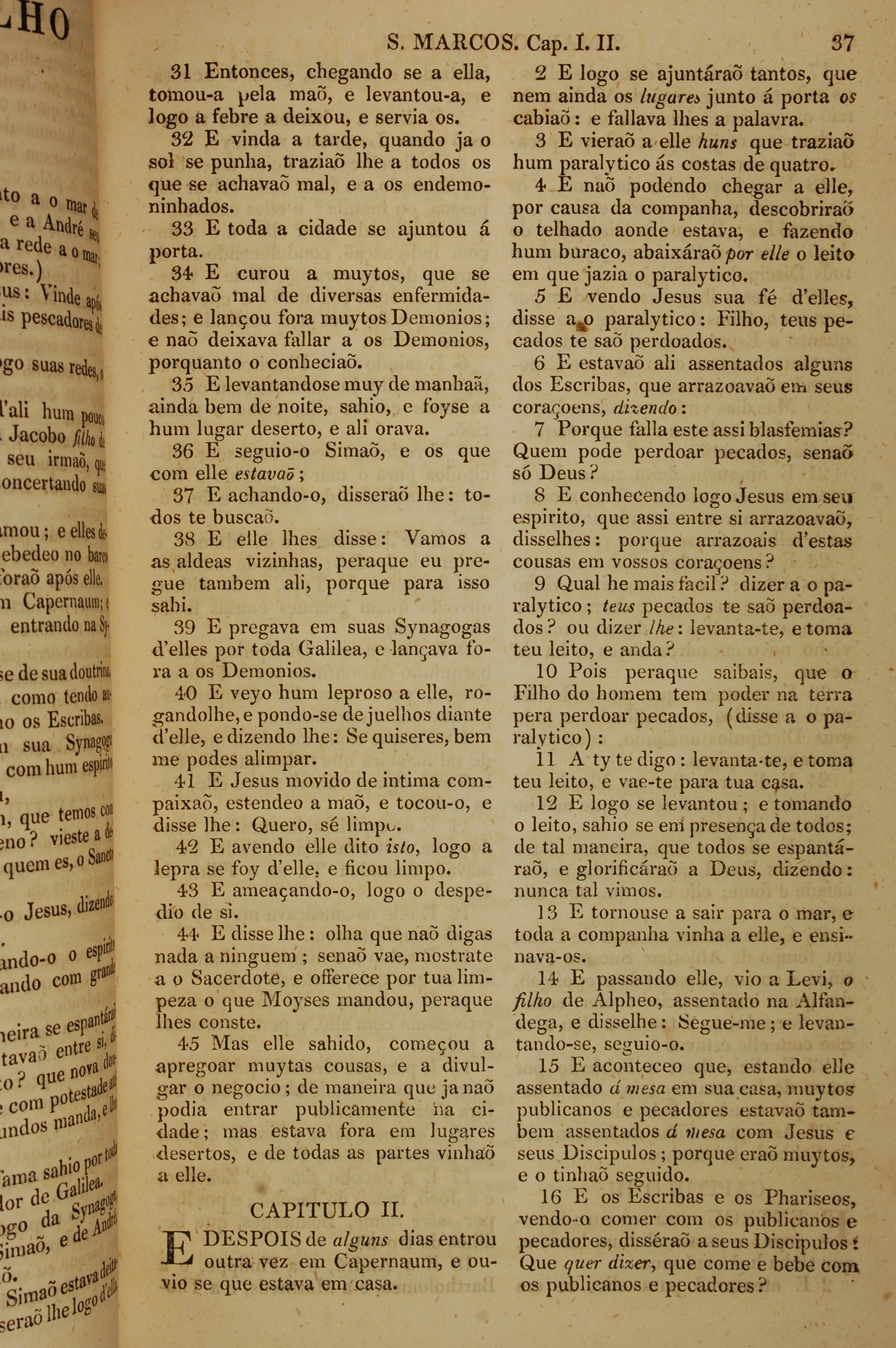 1819年葡萄牙語新約全書 馬可福音 1 章 31 節到 2 章 16 節