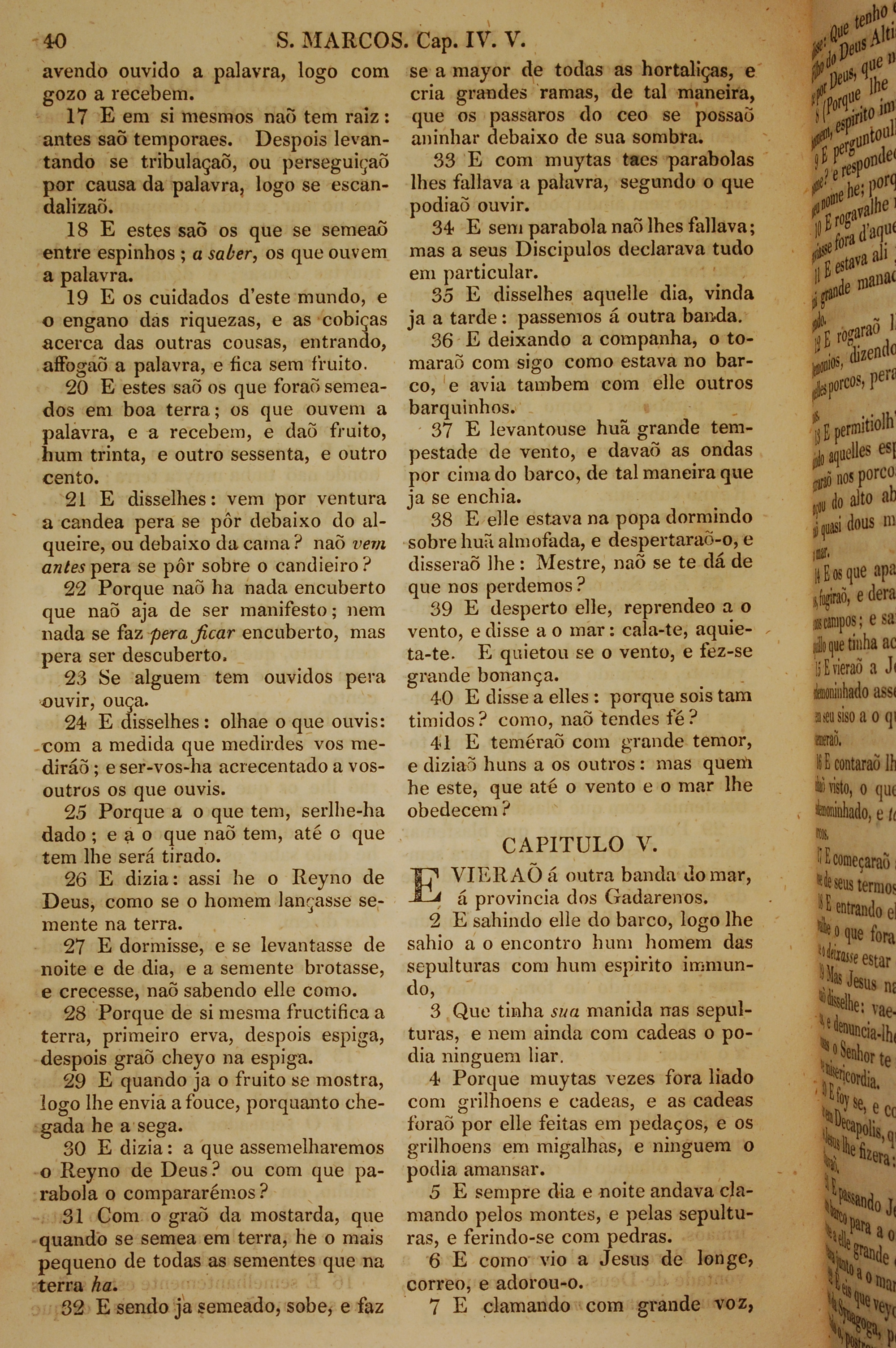 1819年葡萄牙語新約全書 馬可福音 4 章 17 節到 5 章 7 節
