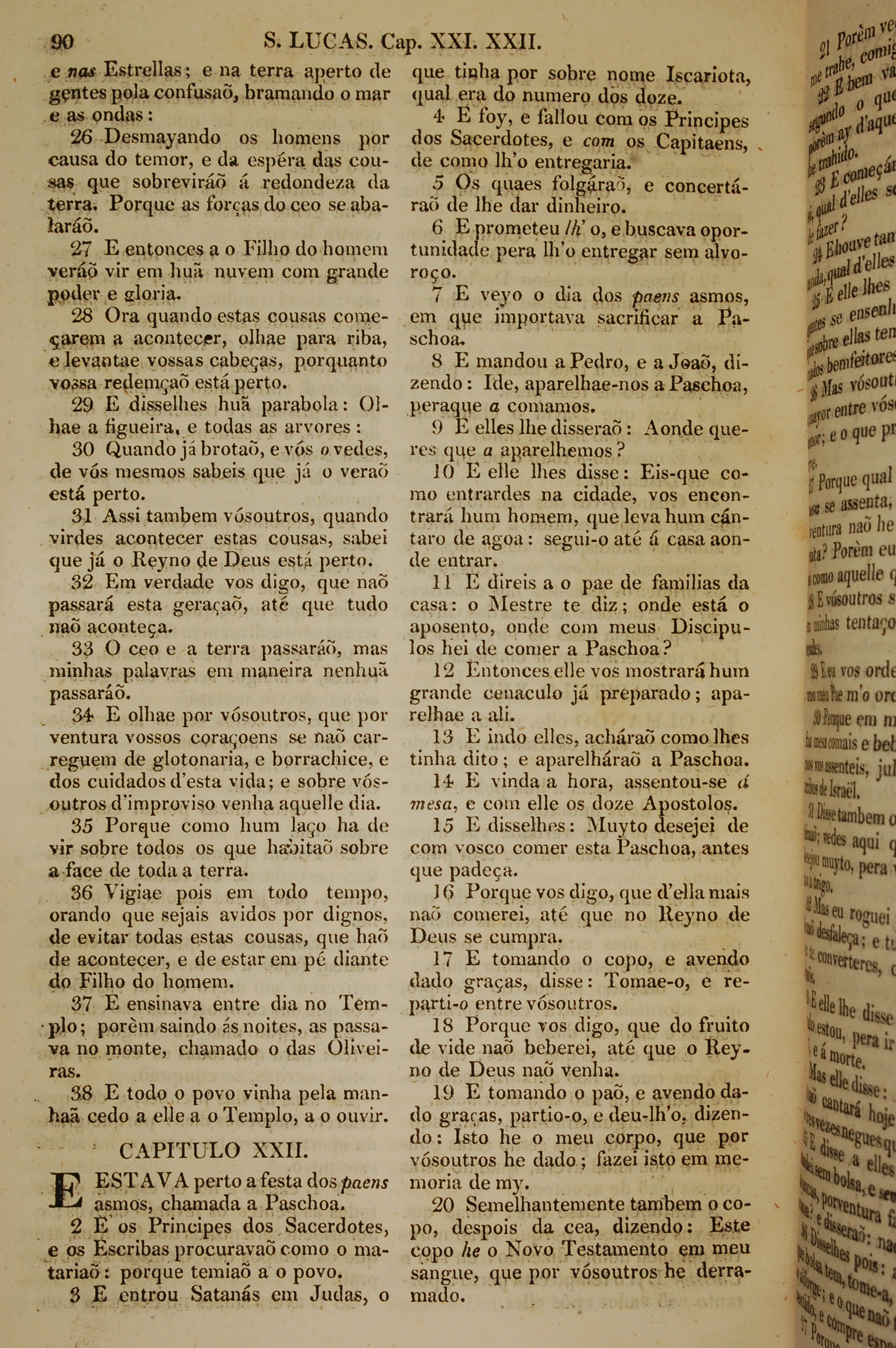 1819年葡萄牙語新約全書 路加福音 21 章 26 節到 22 章 20 節