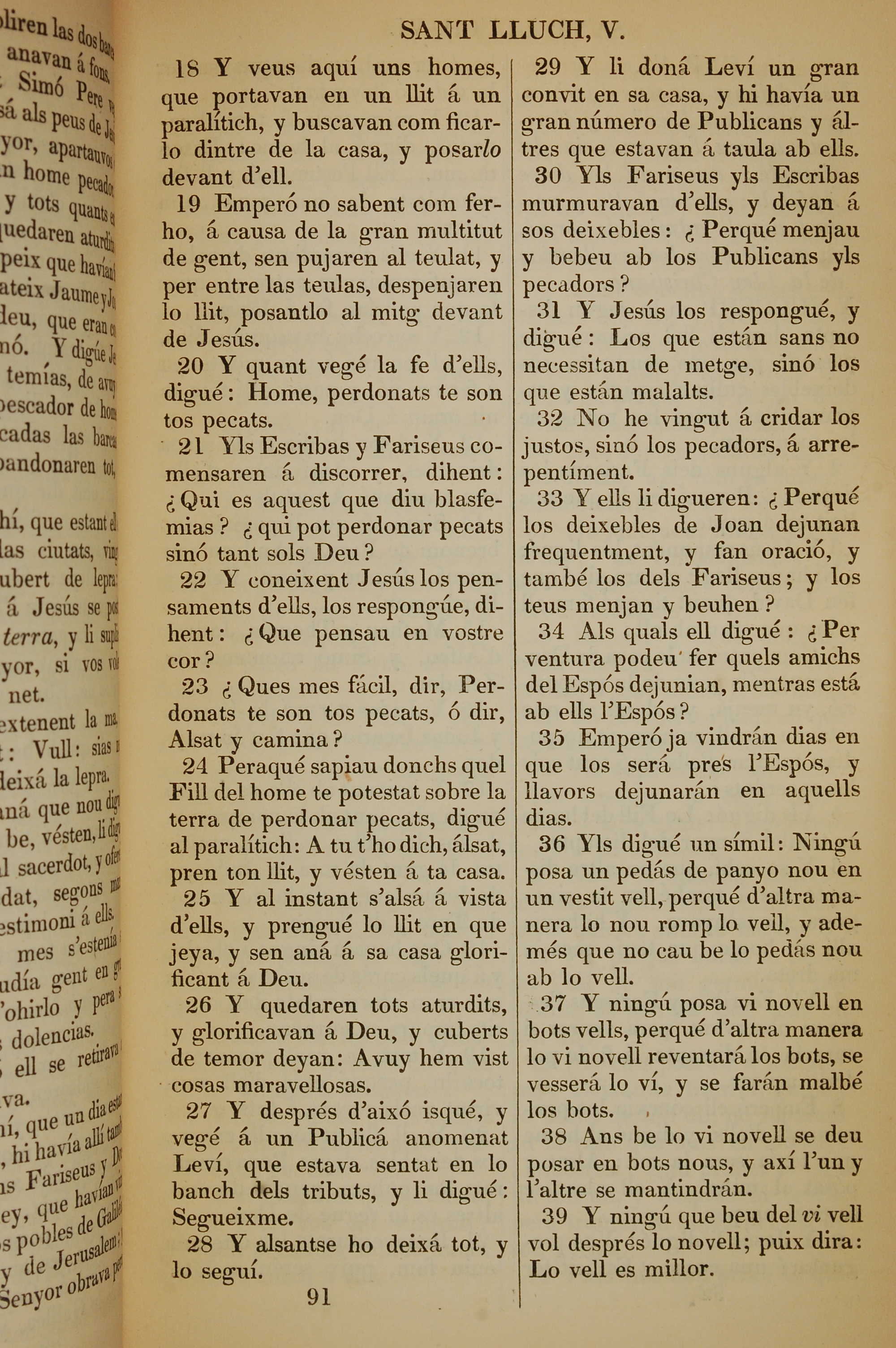 1835年加泰羅尼亞語新約全書 路加福音 5 章 18 節到 5 章 39 節