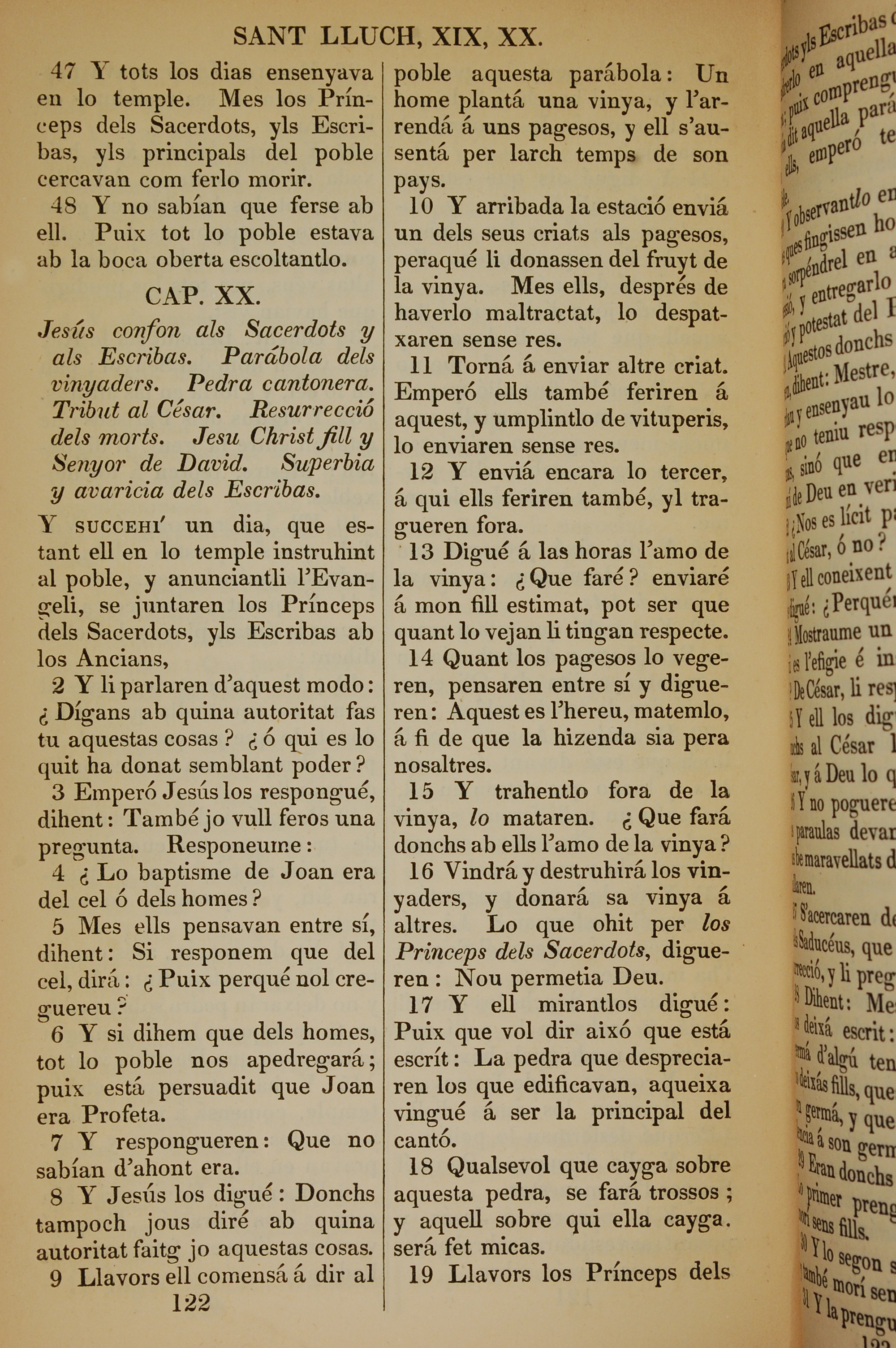 1835年加泰羅尼亞語新約全書 路加福音 19 章 47 節到 20 章 19 節