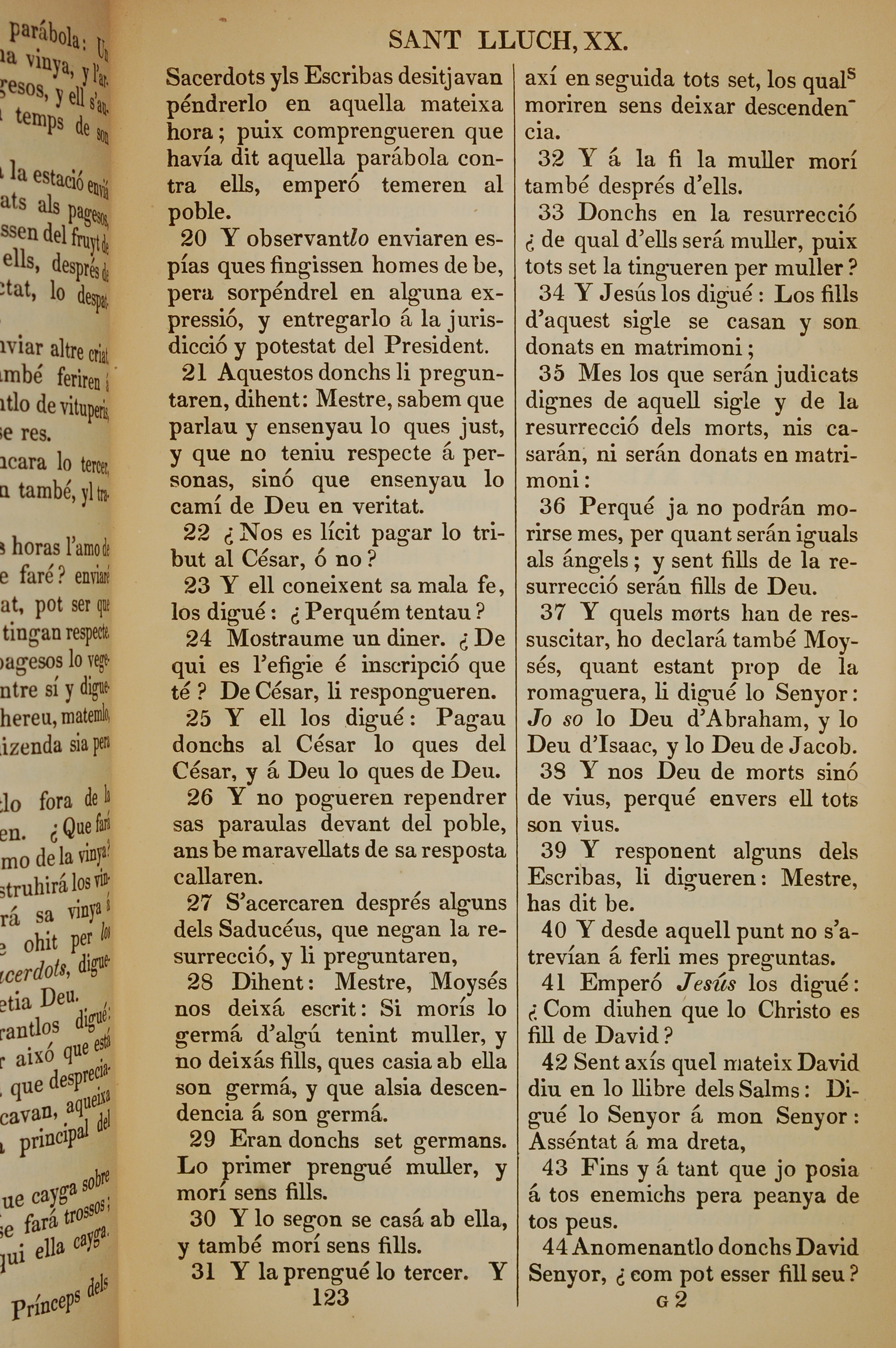1835年加泰羅尼亞語新約全書 路加福音 20 章 20 節到 20 章 44 節