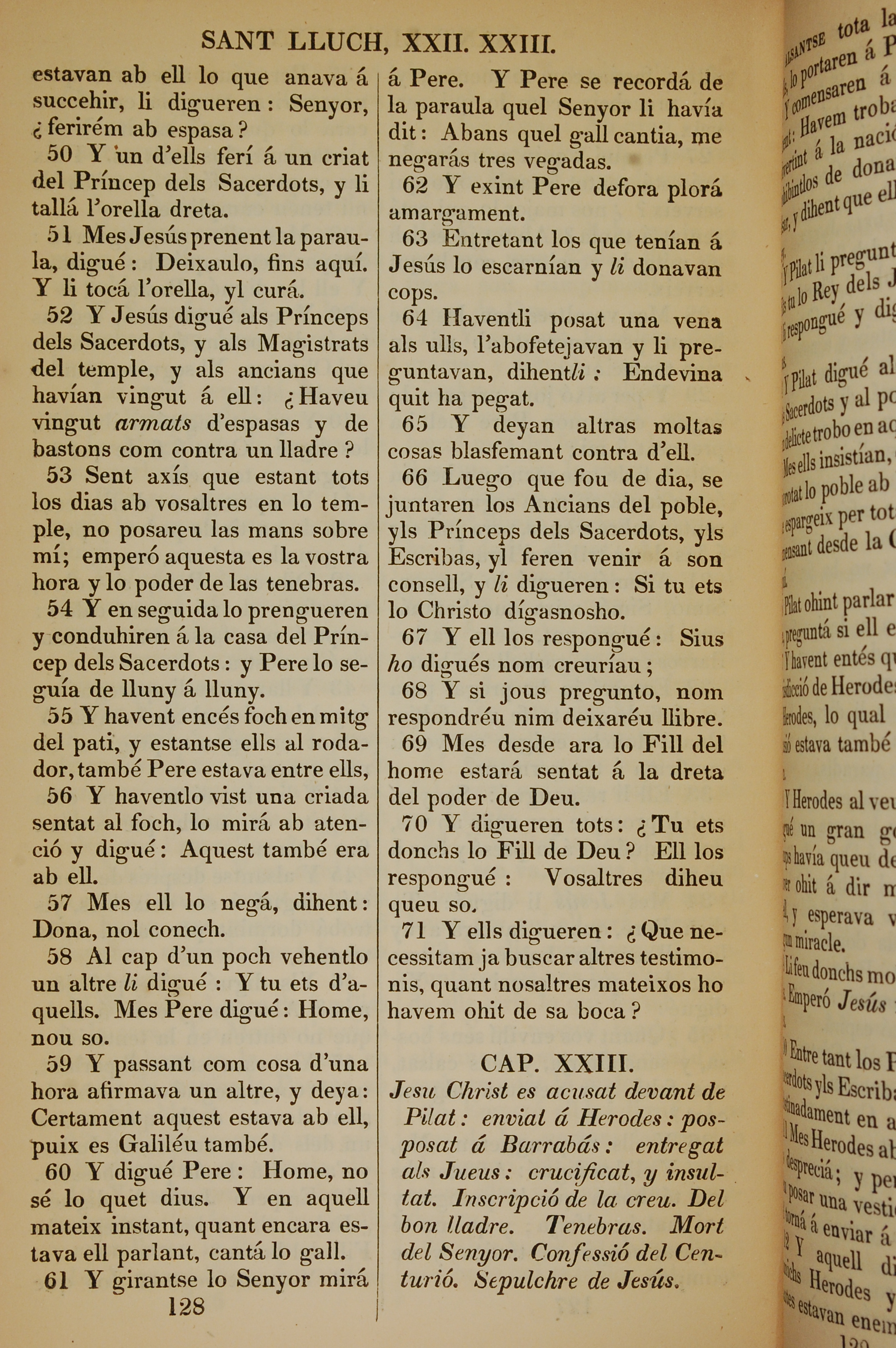 1835年加泰羅尼亞語新約全書 路加福音 22 章 50 節到 22 章 71 節