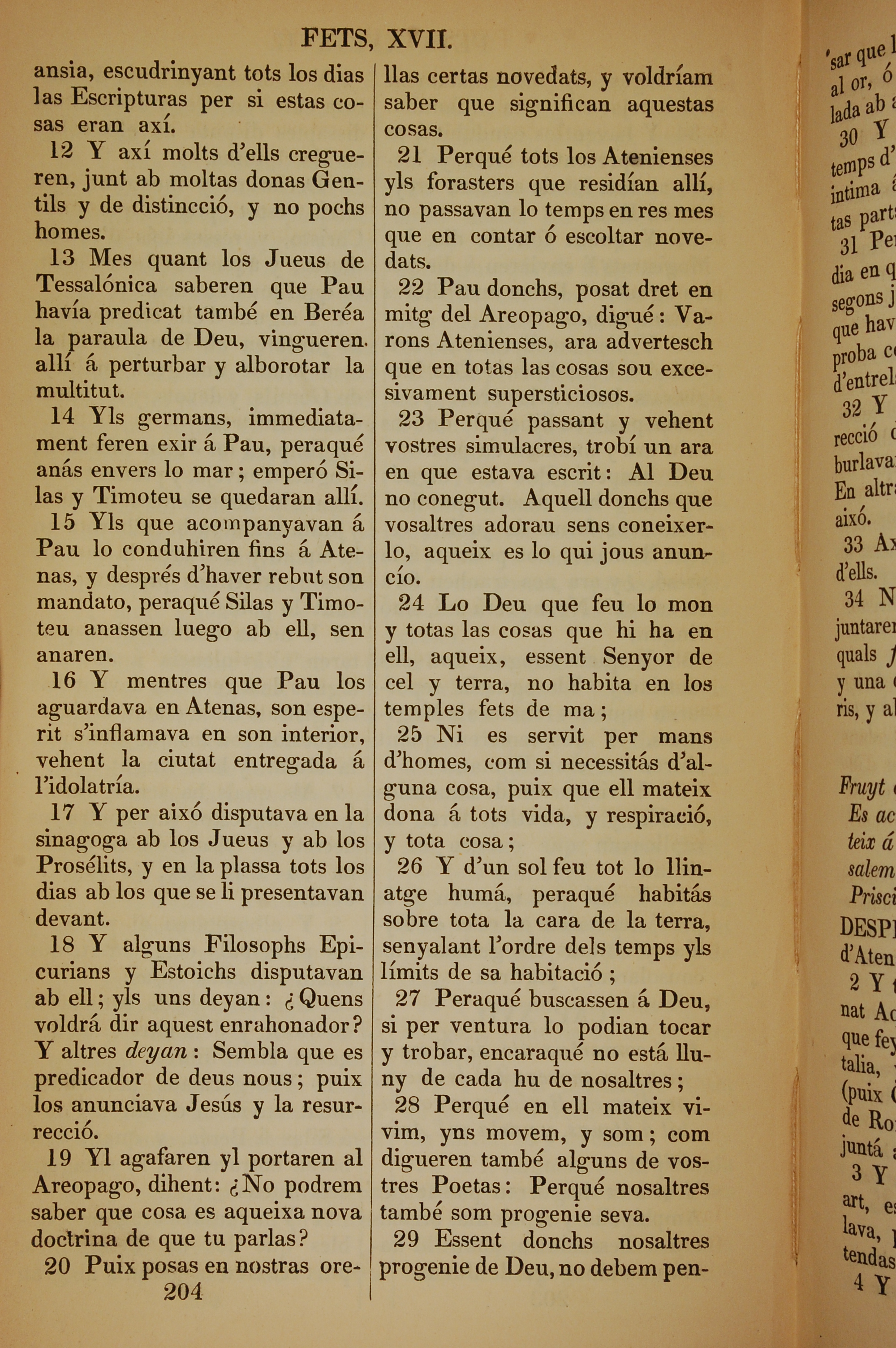 1835年加泰羅尼亞語新約全書 使徒行傳 17 章 12 節到 17 章 29 節