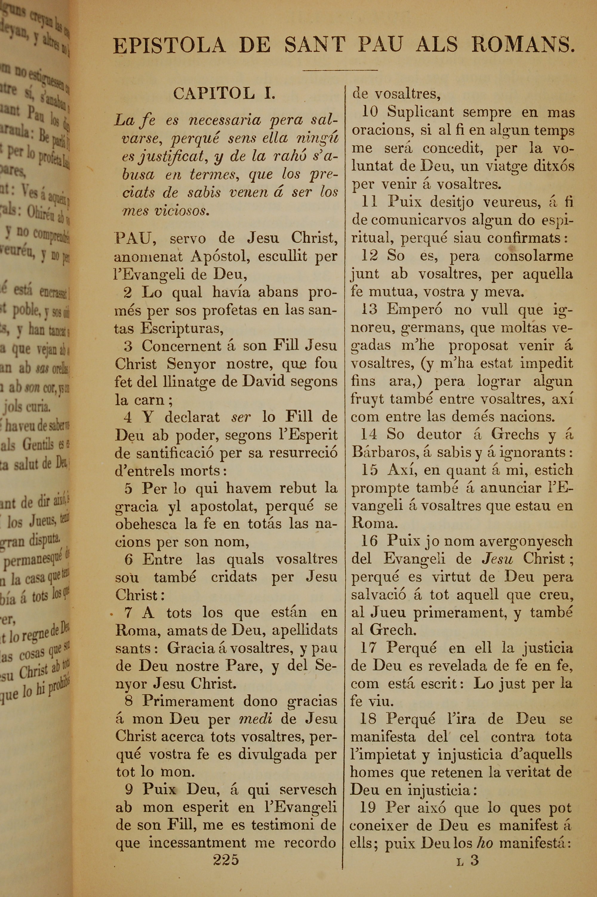 1835年加泰羅尼亞語新約全書 羅馬書 1 章 1 節到 1 章 19 節