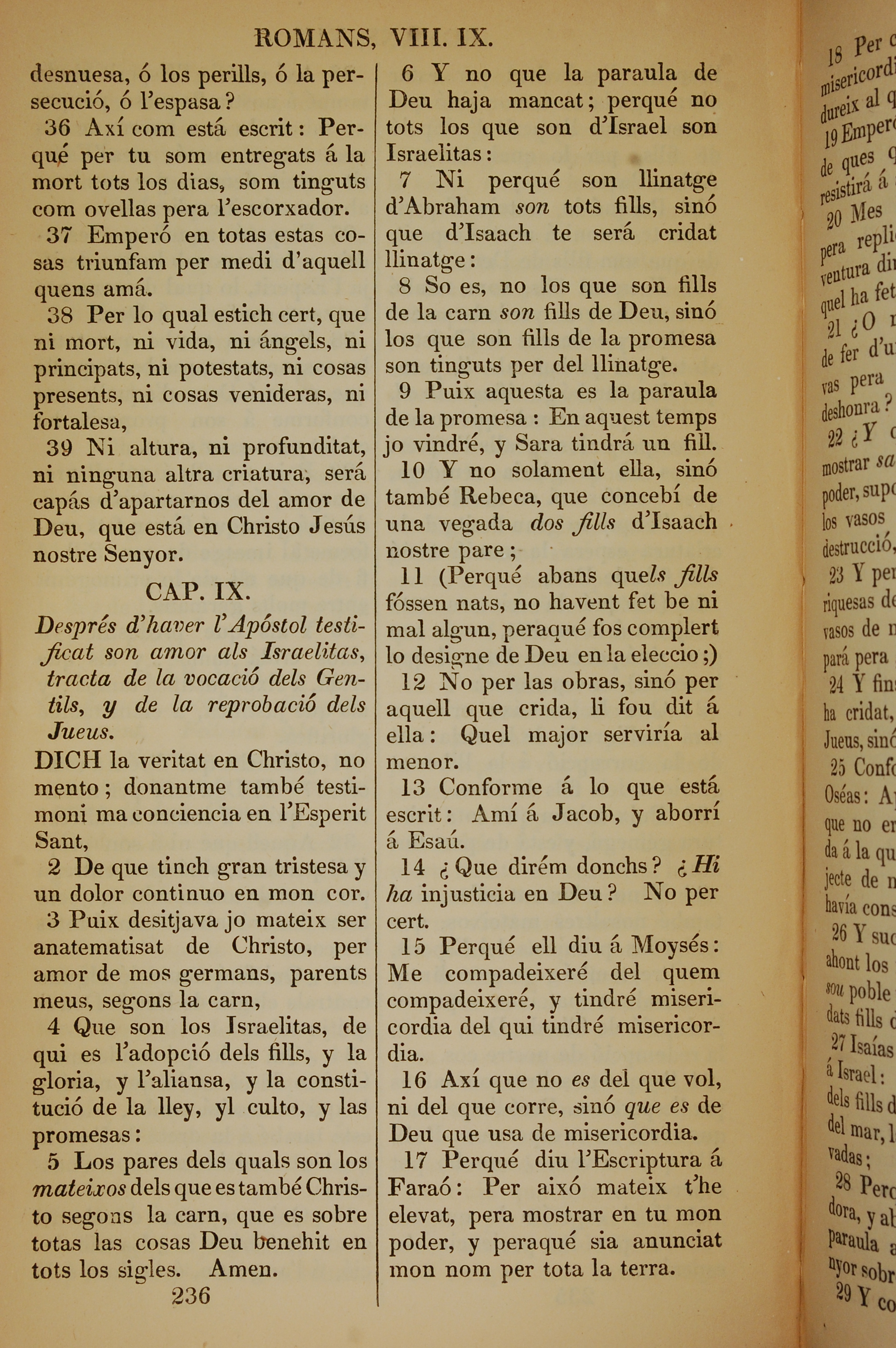 1835年加泰羅尼亞語新約全書 羅馬書 8 章 36 節到 9 章 17 節