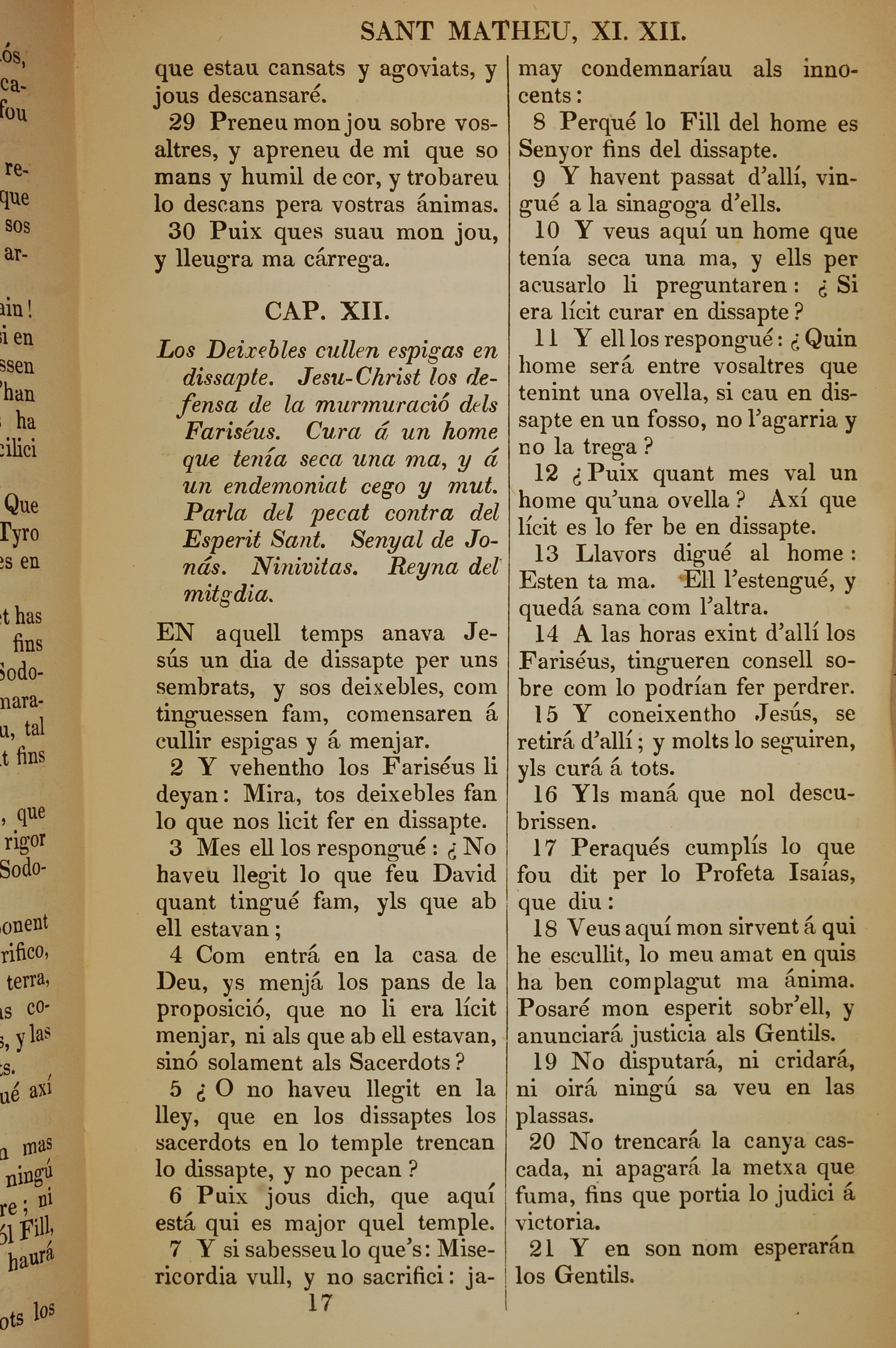 1835年加泰羅尼亞語新約全書 馬太福音 11 章 29 節到 12 章 21 節