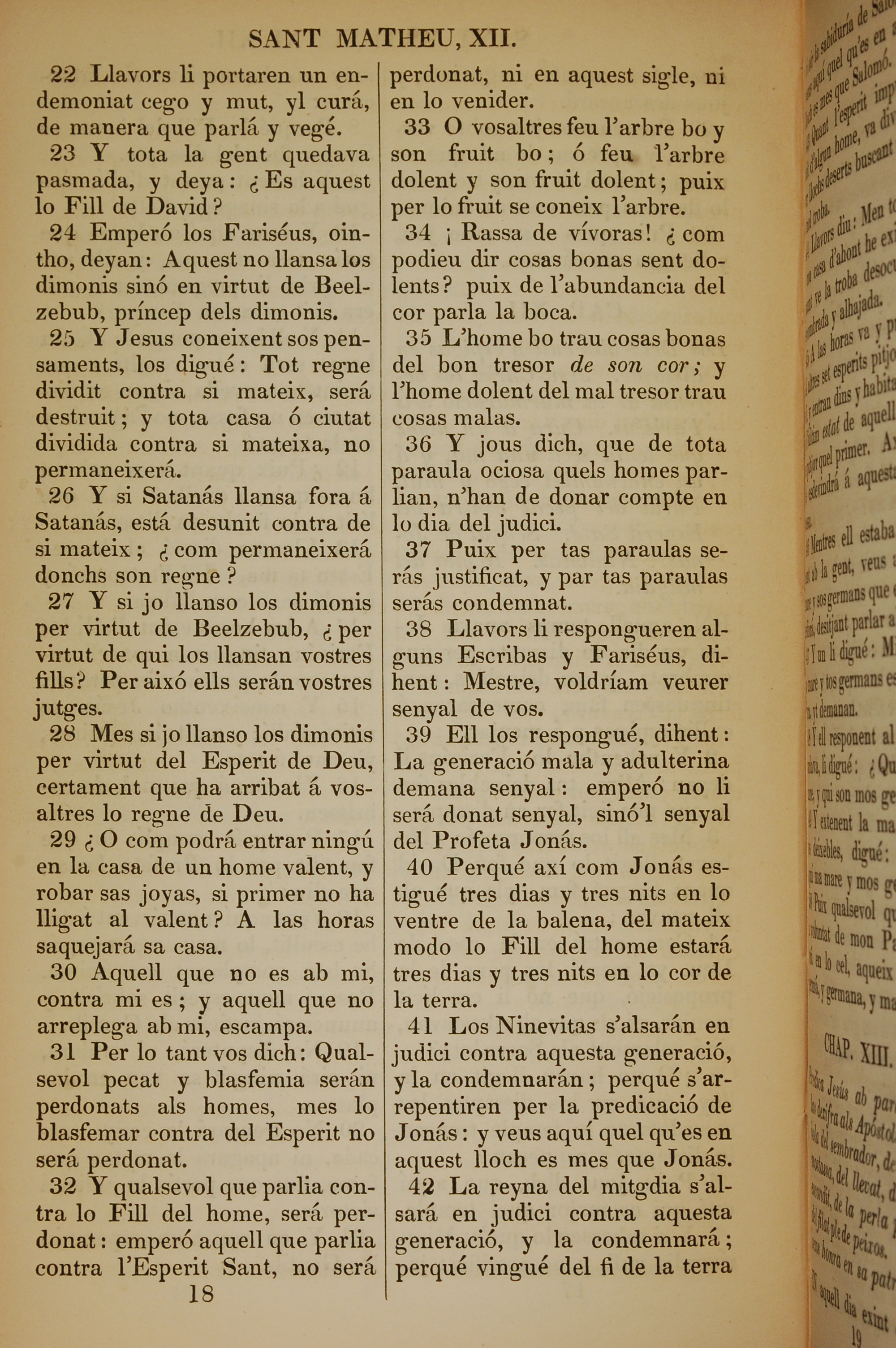 1835年加泰羅尼亞語新約全書 馬太福音 12 章 22 節到 12 章 42 節