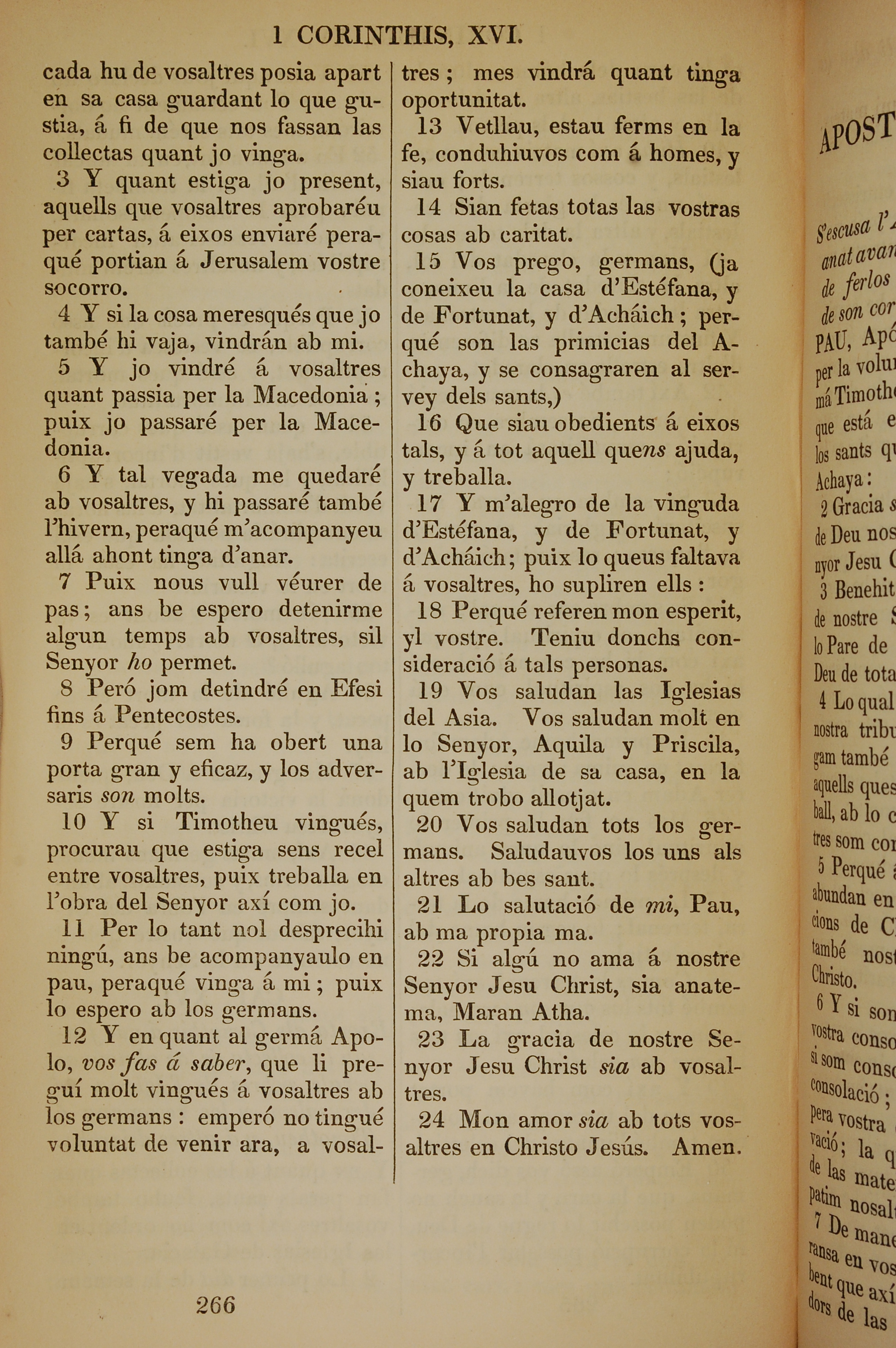 1835年加泰羅尼亞語新約全書 哥林多前書 16 章 3 節到 16 章 24 節