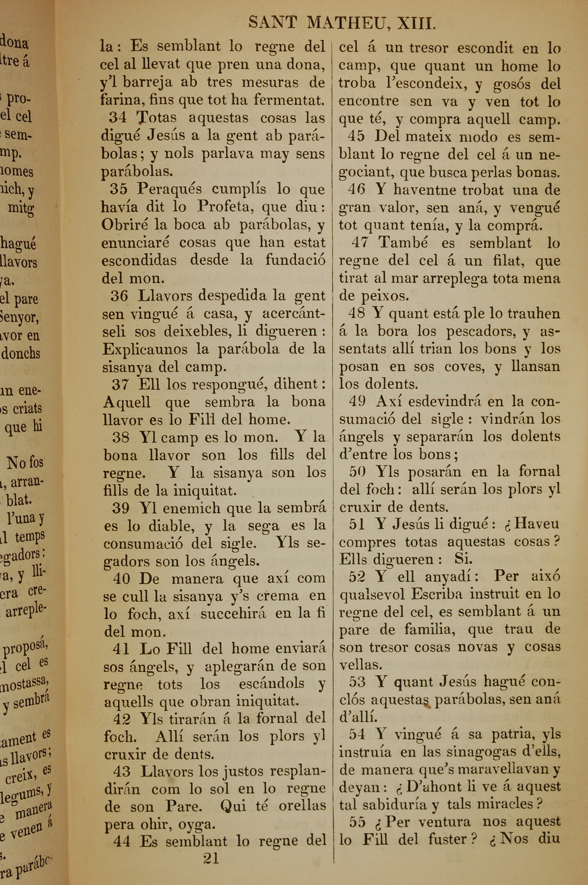 1835年加泰羅尼亞語新約全書 馬太福音 13 章 34 節到 13 章 55 節