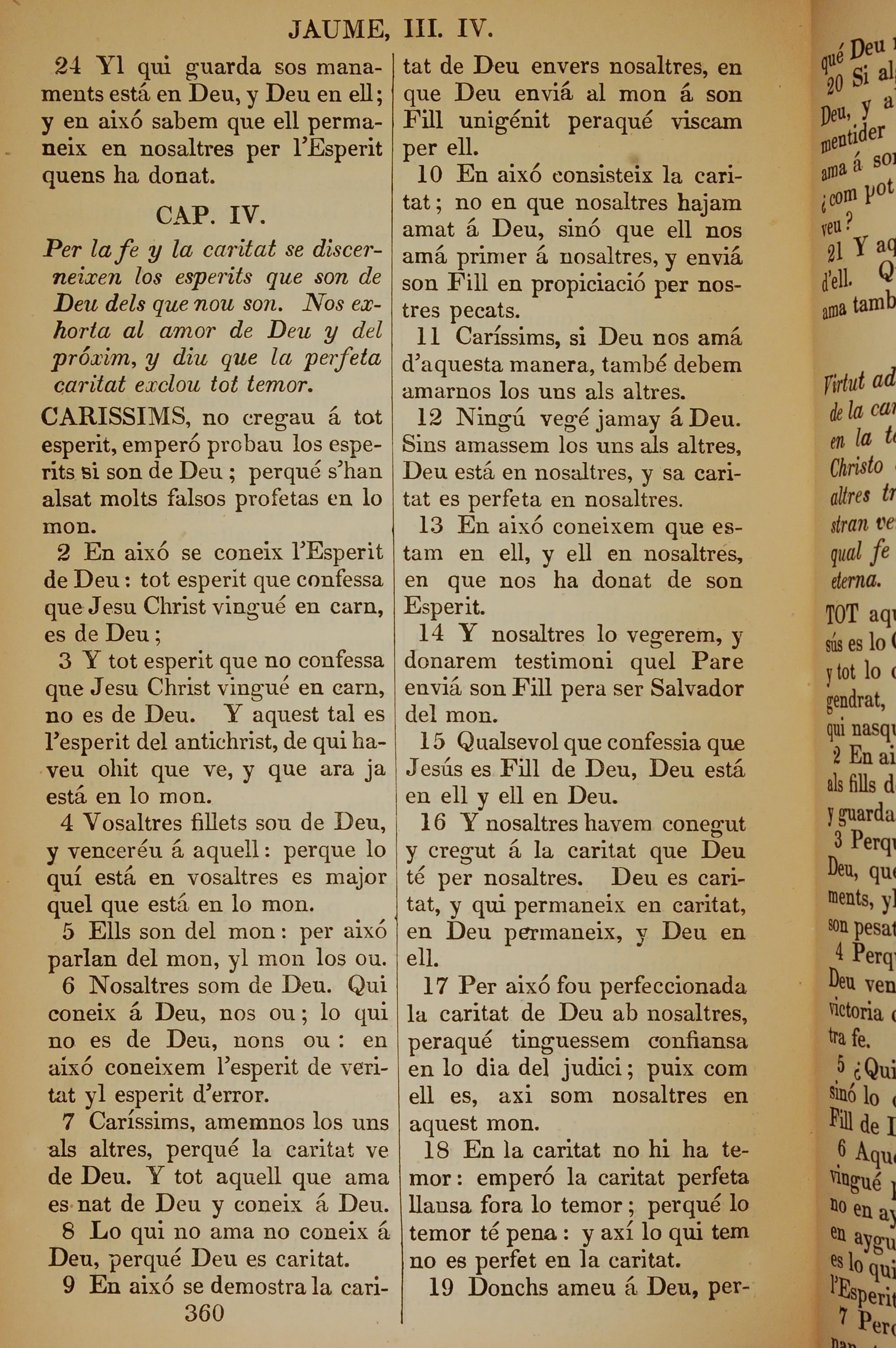 1835年加泰羅尼亞語新約全書 約翰一書 3 章 24 節到 4 章 19 節