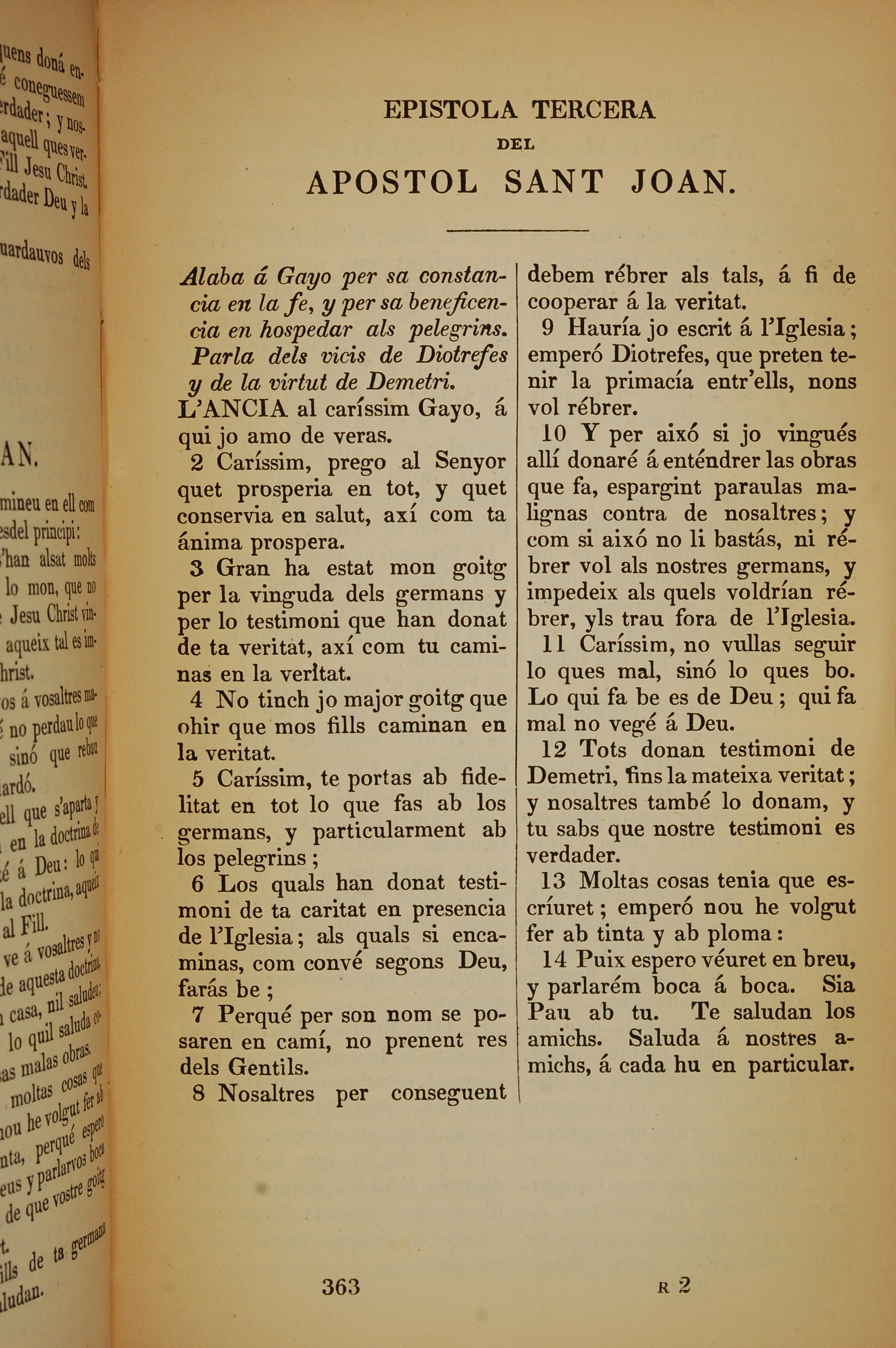 1835年加泰羅尼亞語新約全書 約翰三書 1 章 1 節到 1 章 14 節