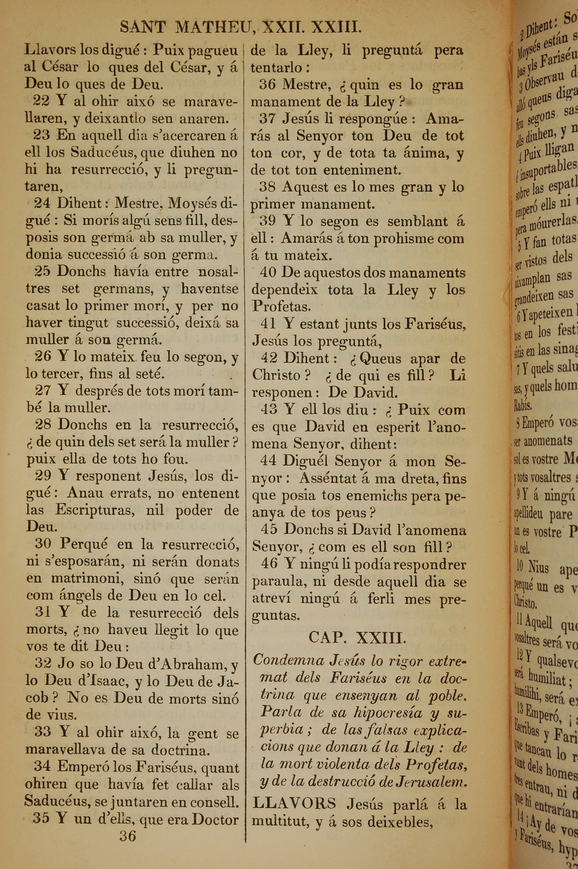 1835年加泰羅尼亞語新約全書 馬太福音 22 章 22 節到 23 章 1 節
