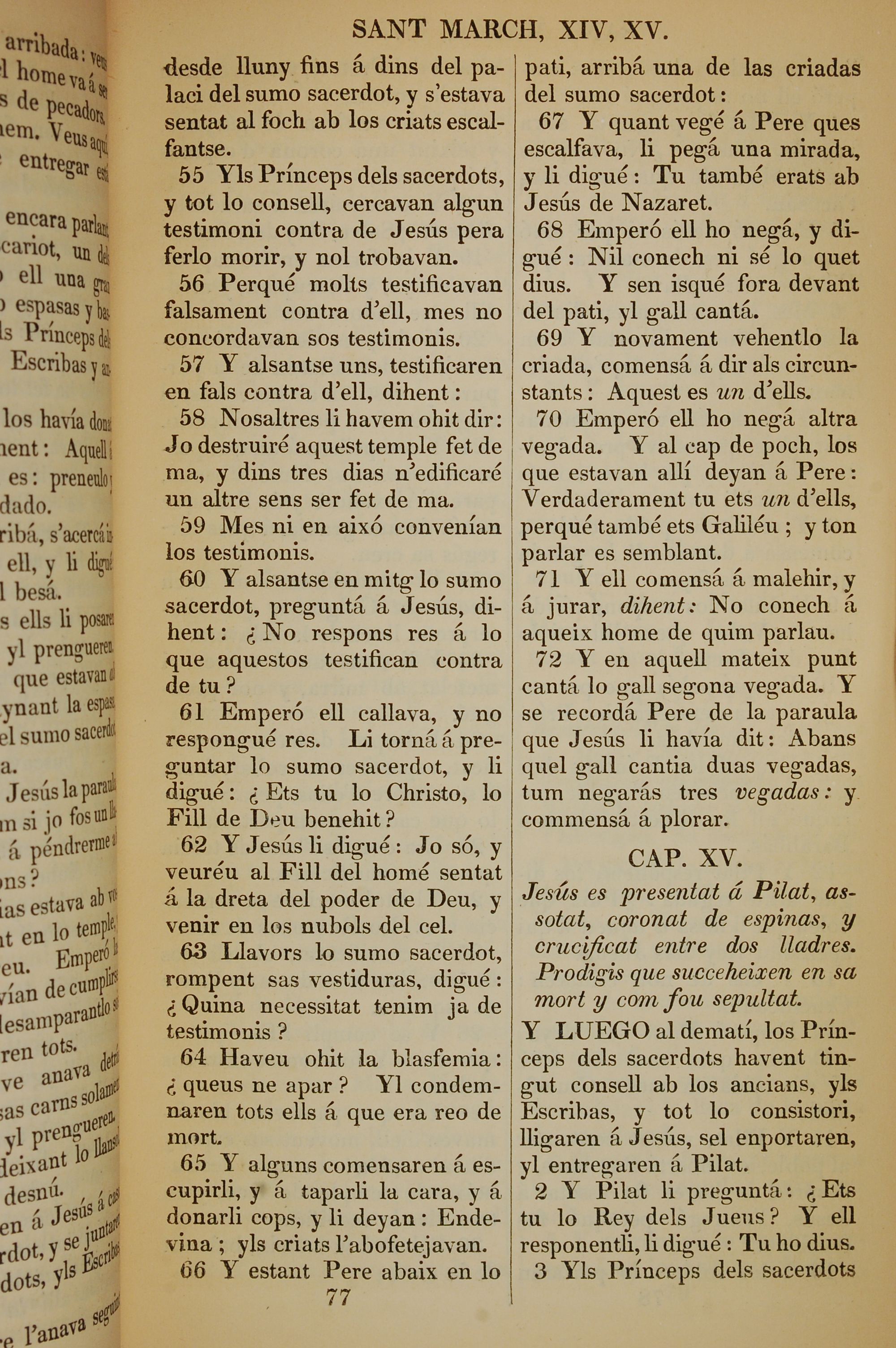 1835年加泰羅尼亞語新約全書 馬可福音 14 章 55 節到 15 章 3 節