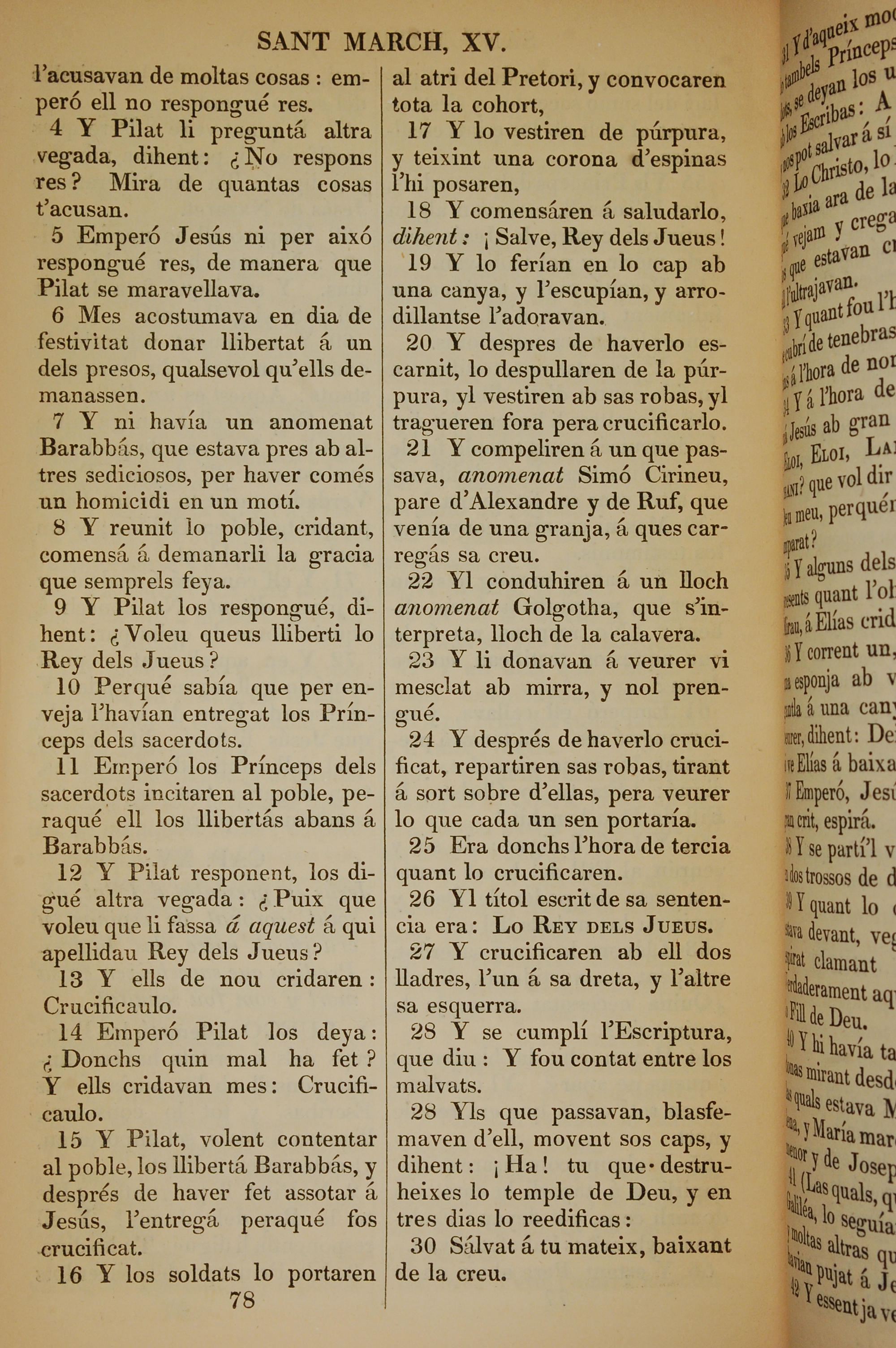 1835年加泰羅尼亞語新約全書 馬可福音 15 章 4 節到 15 章 30 節