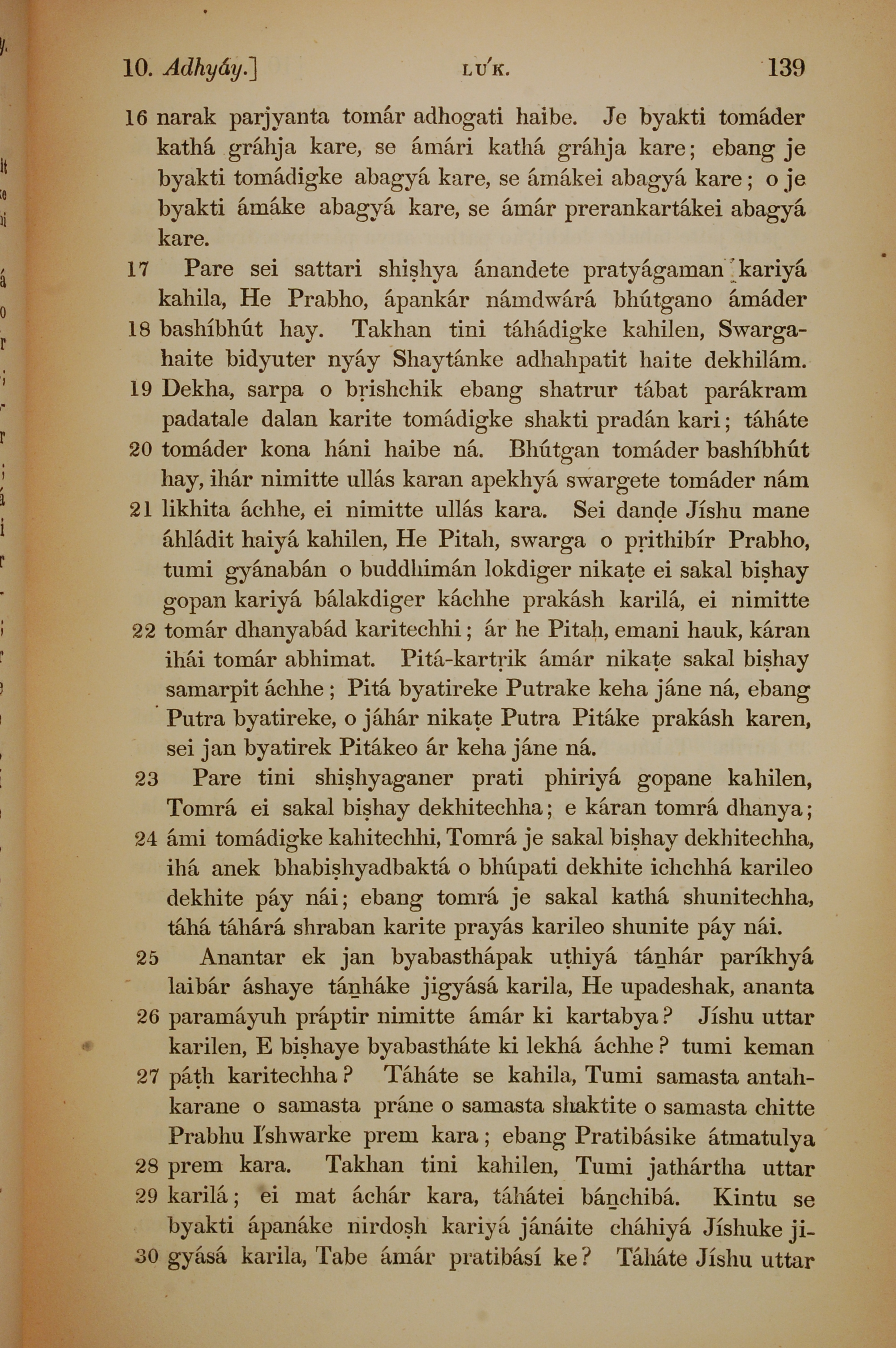 1839年孟加拉語新約全書 路加福音 10 章 16 節到 10 章 30 節