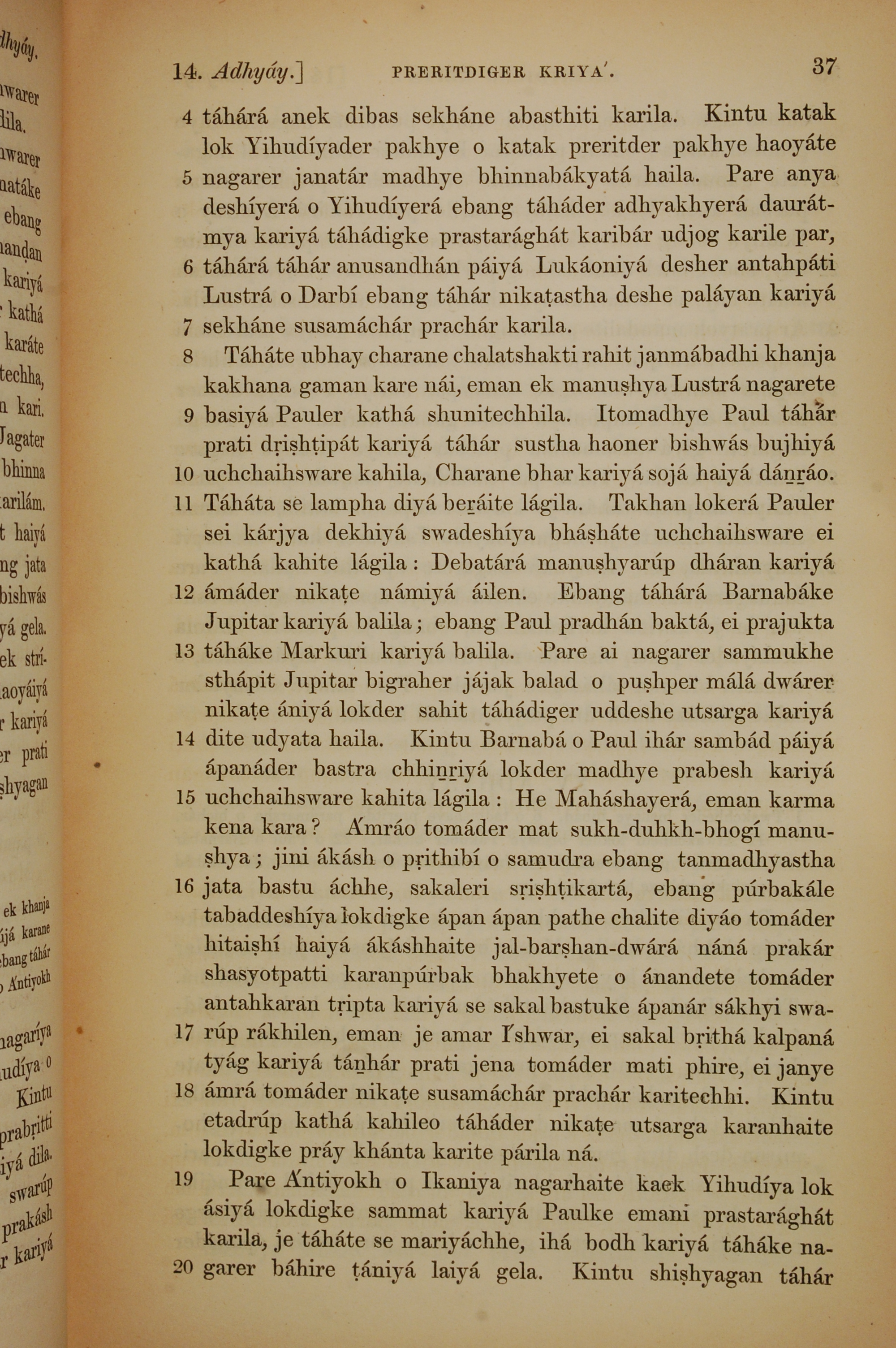 1839年孟加拉語新約全書 使徒行傳 14 章 4 節到 14 章 20 節