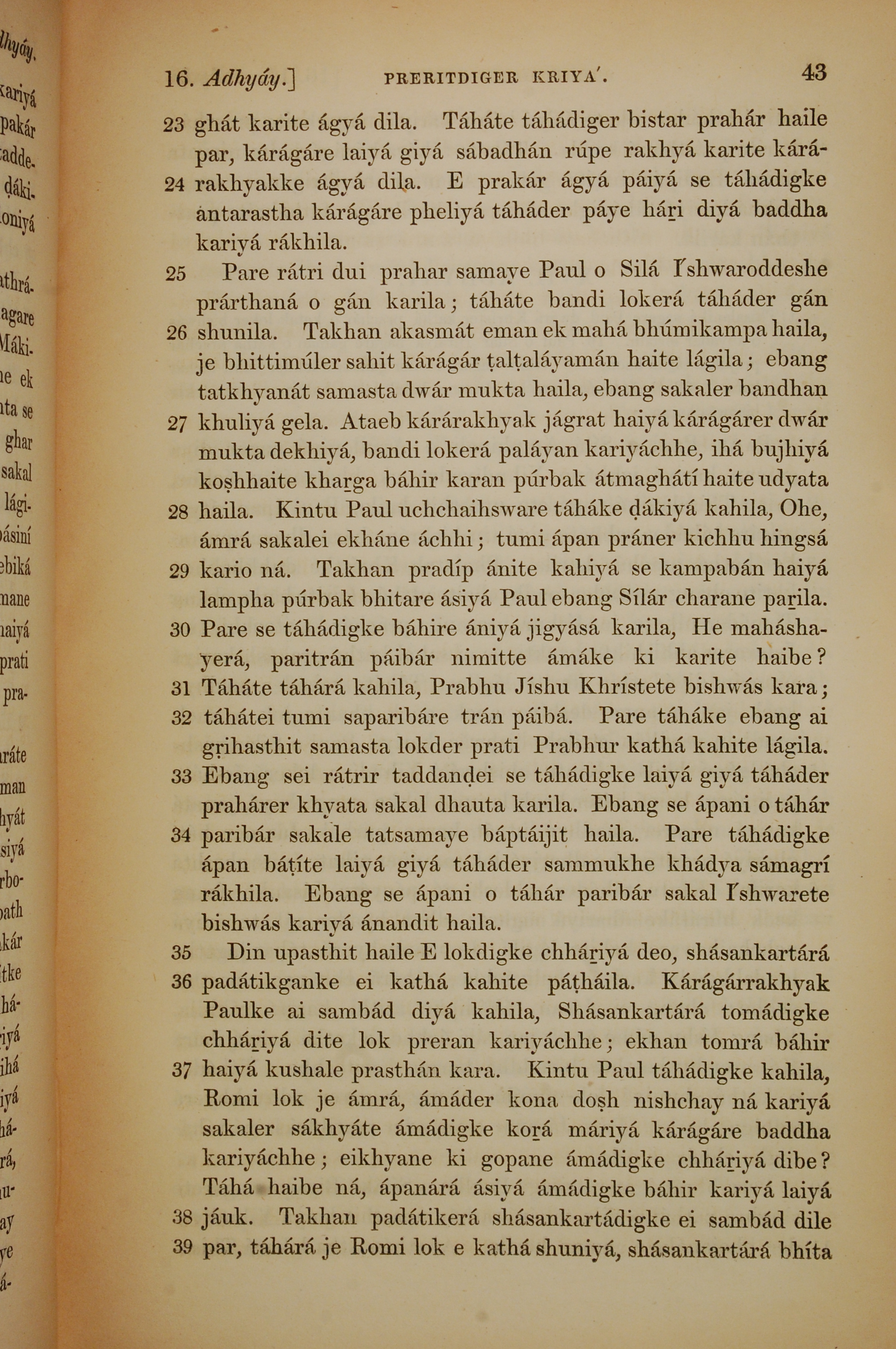 1839年孟加拉語新約全書 使徒行傳 16 章 23 節到 16 章 39 節