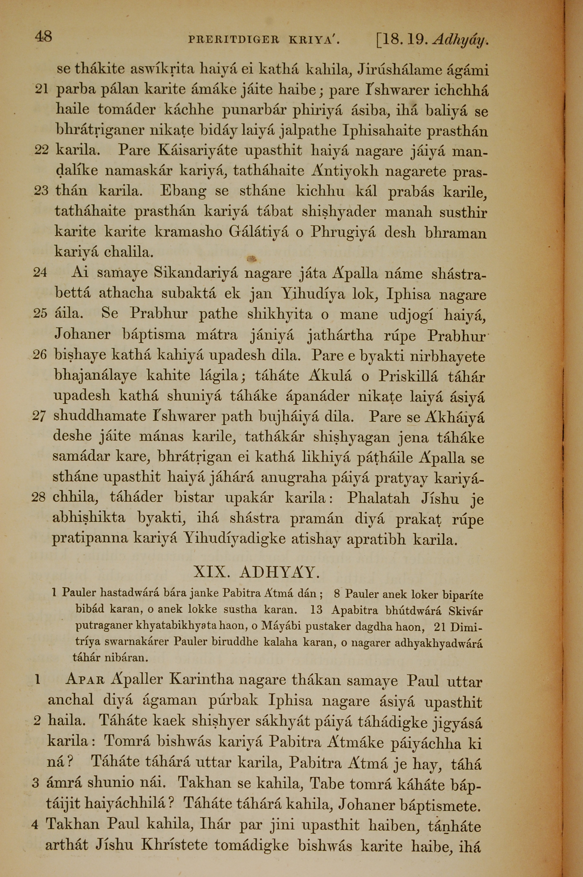 1839年孟加拉語新約全書 使徒行傳 18 章 21 節到 19 章 4 節