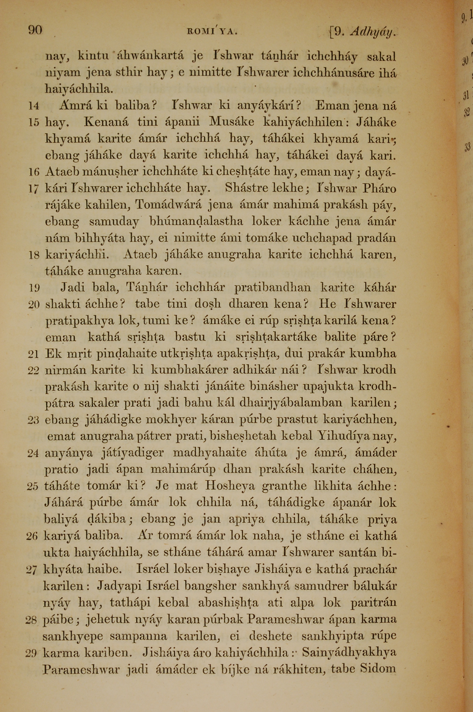 1839年孟加拉語新約全書 羅馬書 9 章 14 節到 9 章 29 節
