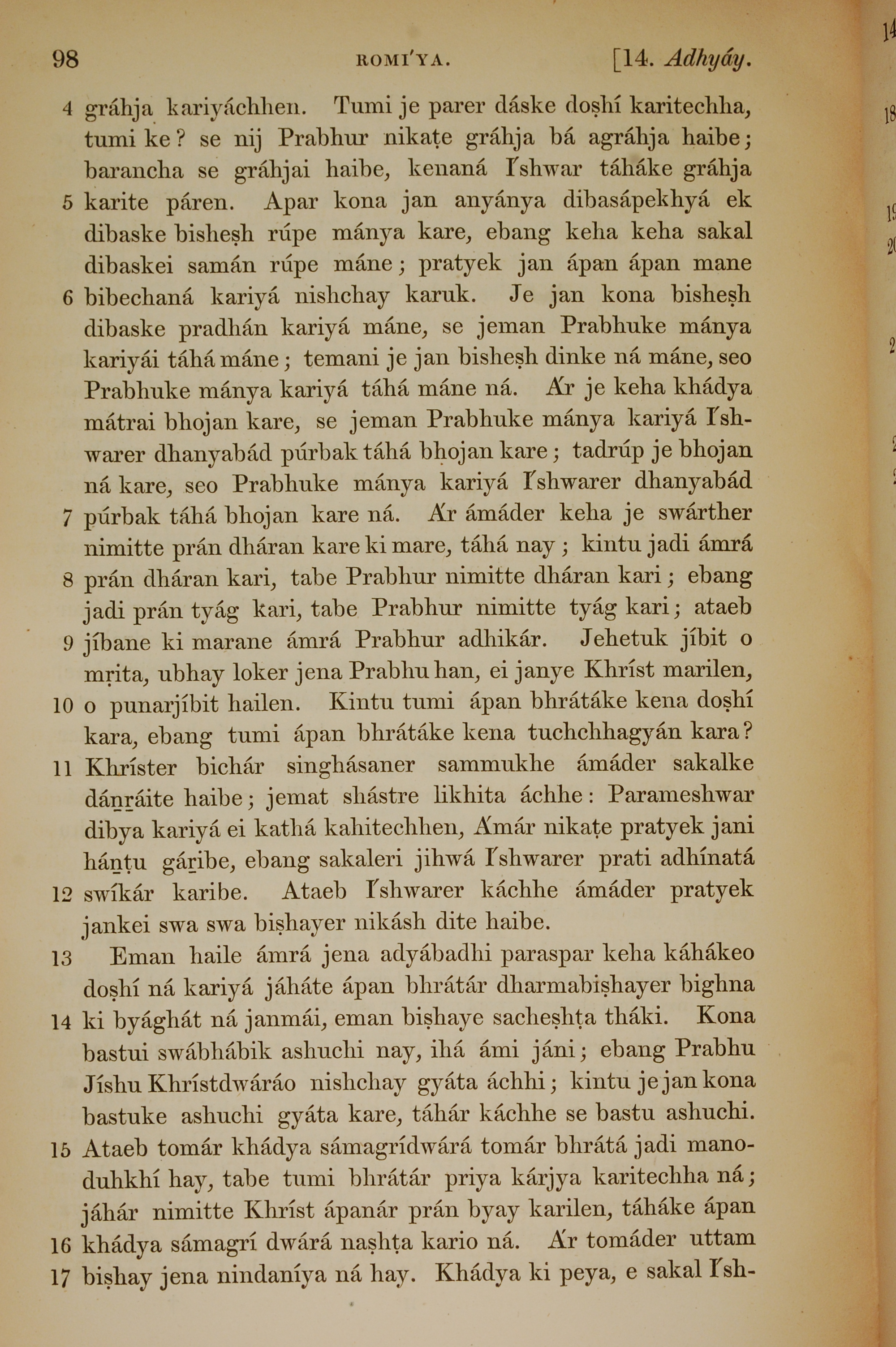 1839年孟加拉語新約全書 羅馬書 14 章 4 節到 14 章 17 節
