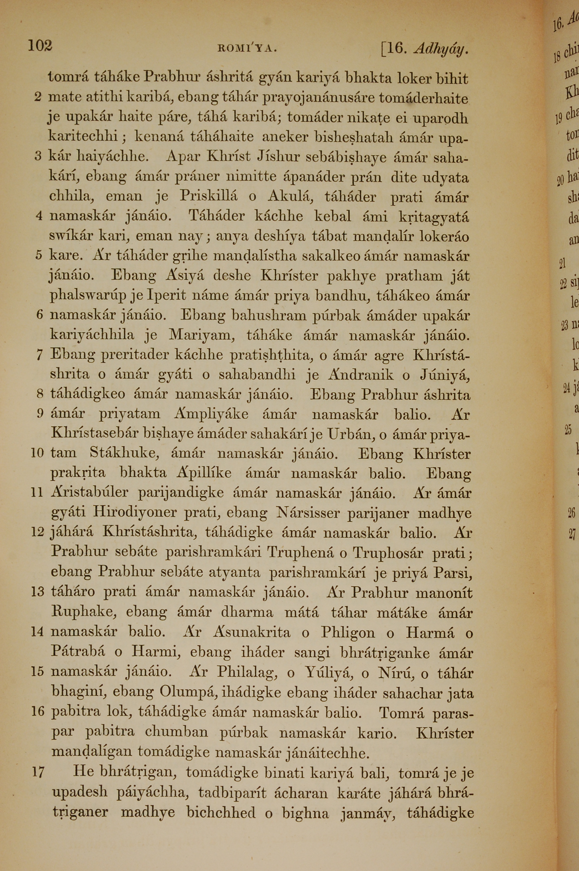 1839年孟加拉語新約全書 羅馬書 16 章 2 節到 16 章 17 節