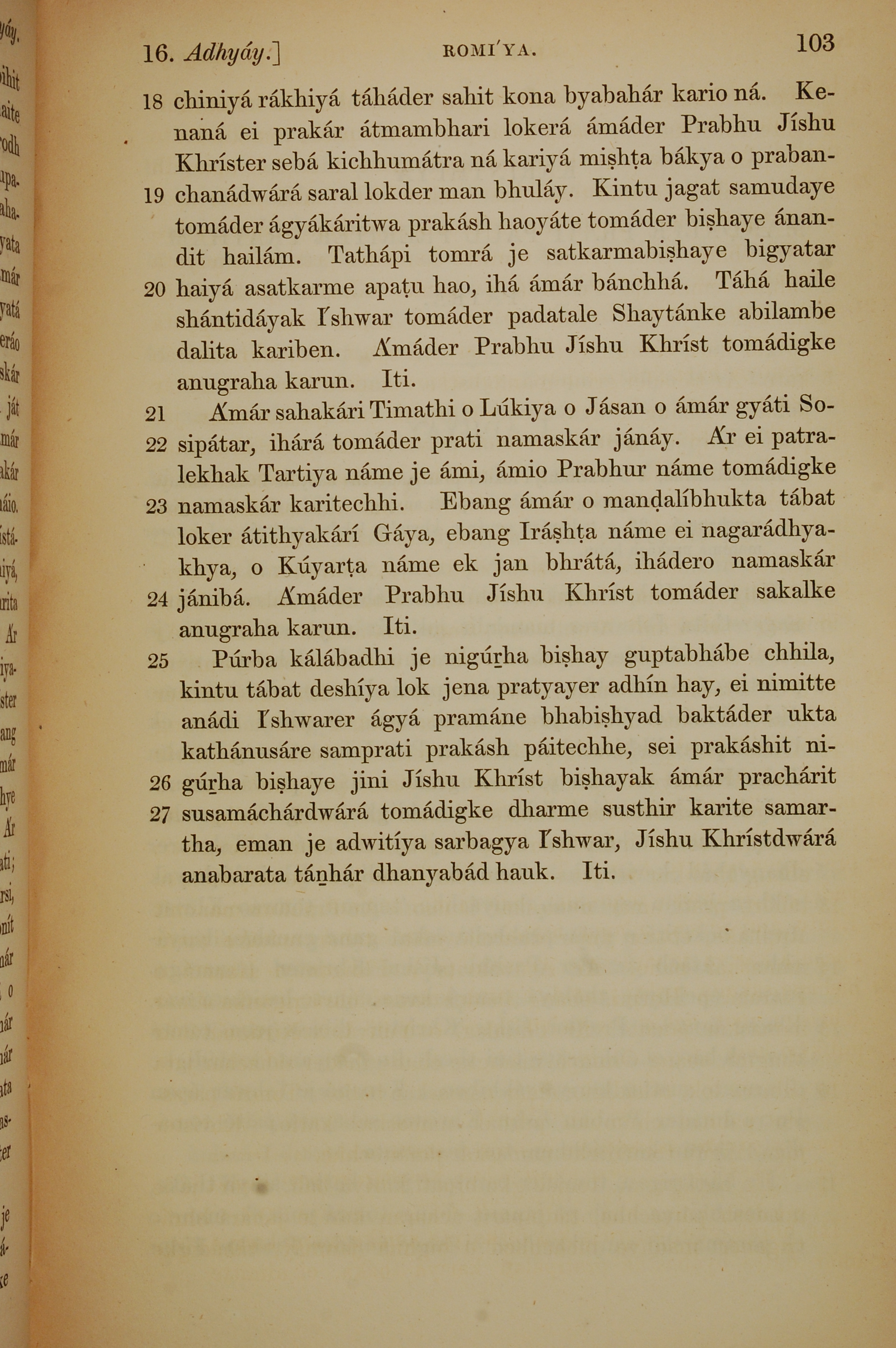 1839年孟加拉語新約全書 羅馬書 16 章 18 節到 17 章 27 節