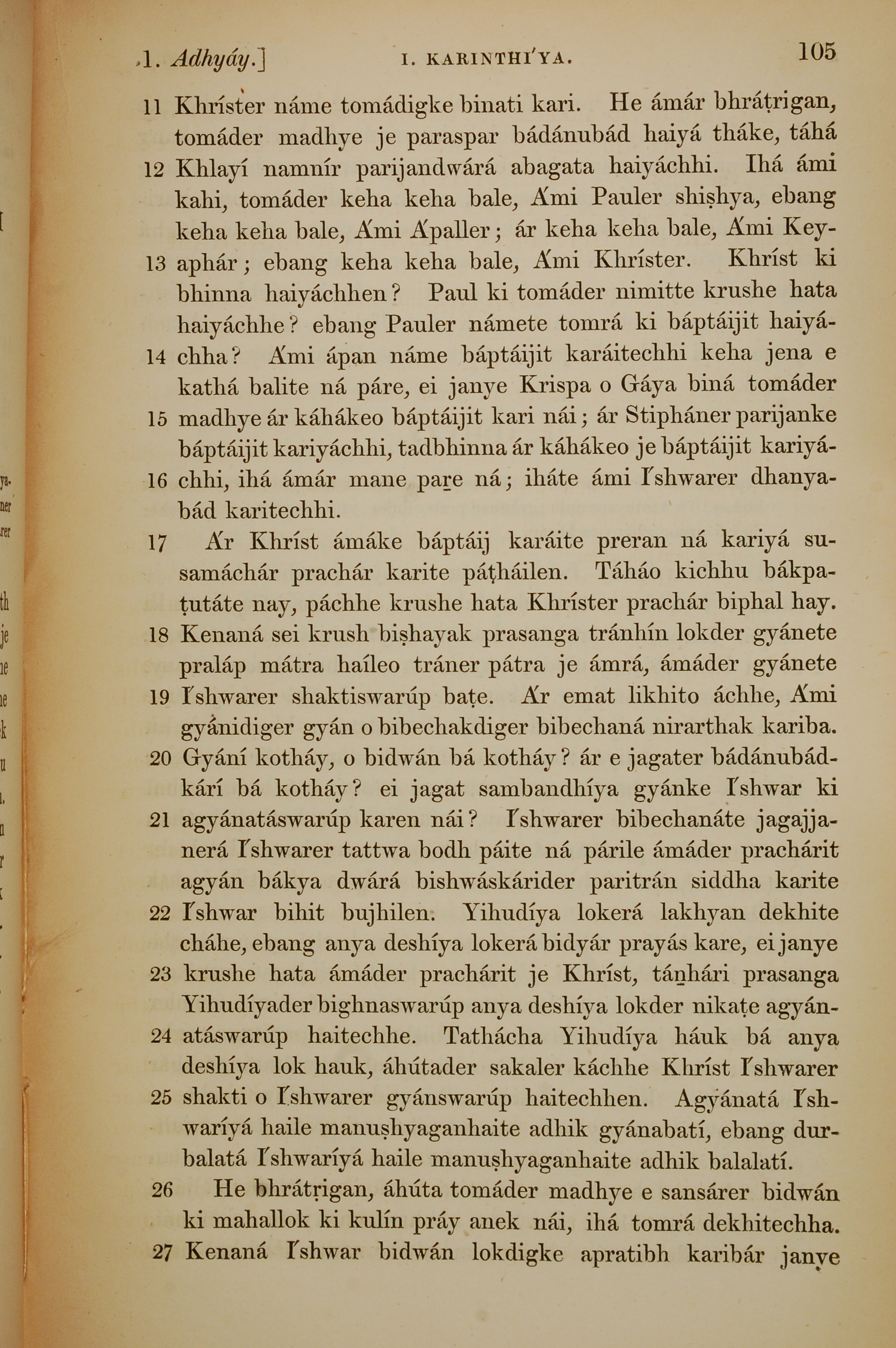1839年孟加拉語新約全書 哥林多前書 1 章 11 節到 1 章 27 節