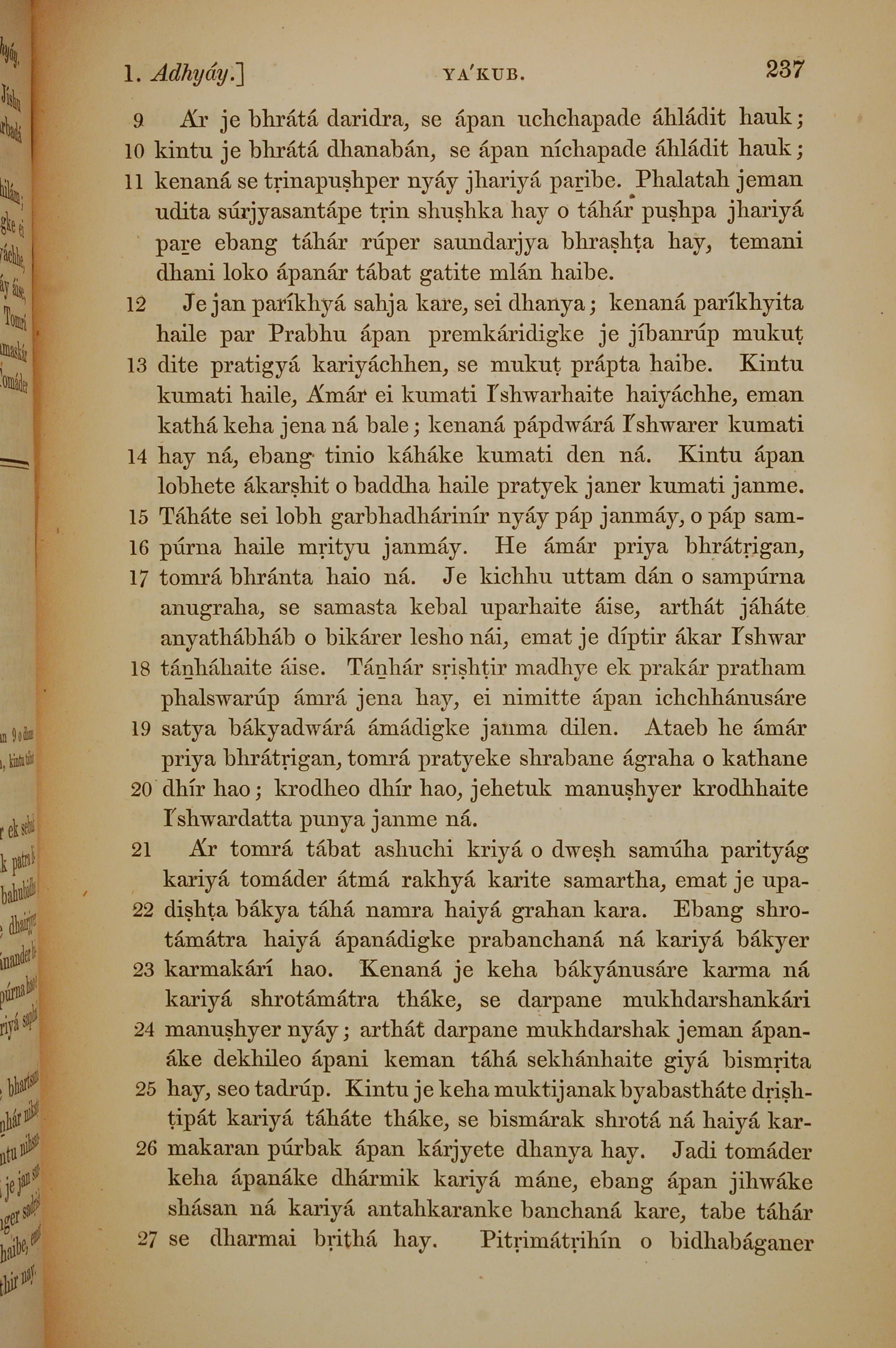 1839年孟加拉語新約全書 雅各書 1 章 9 節到 1 章 27 節