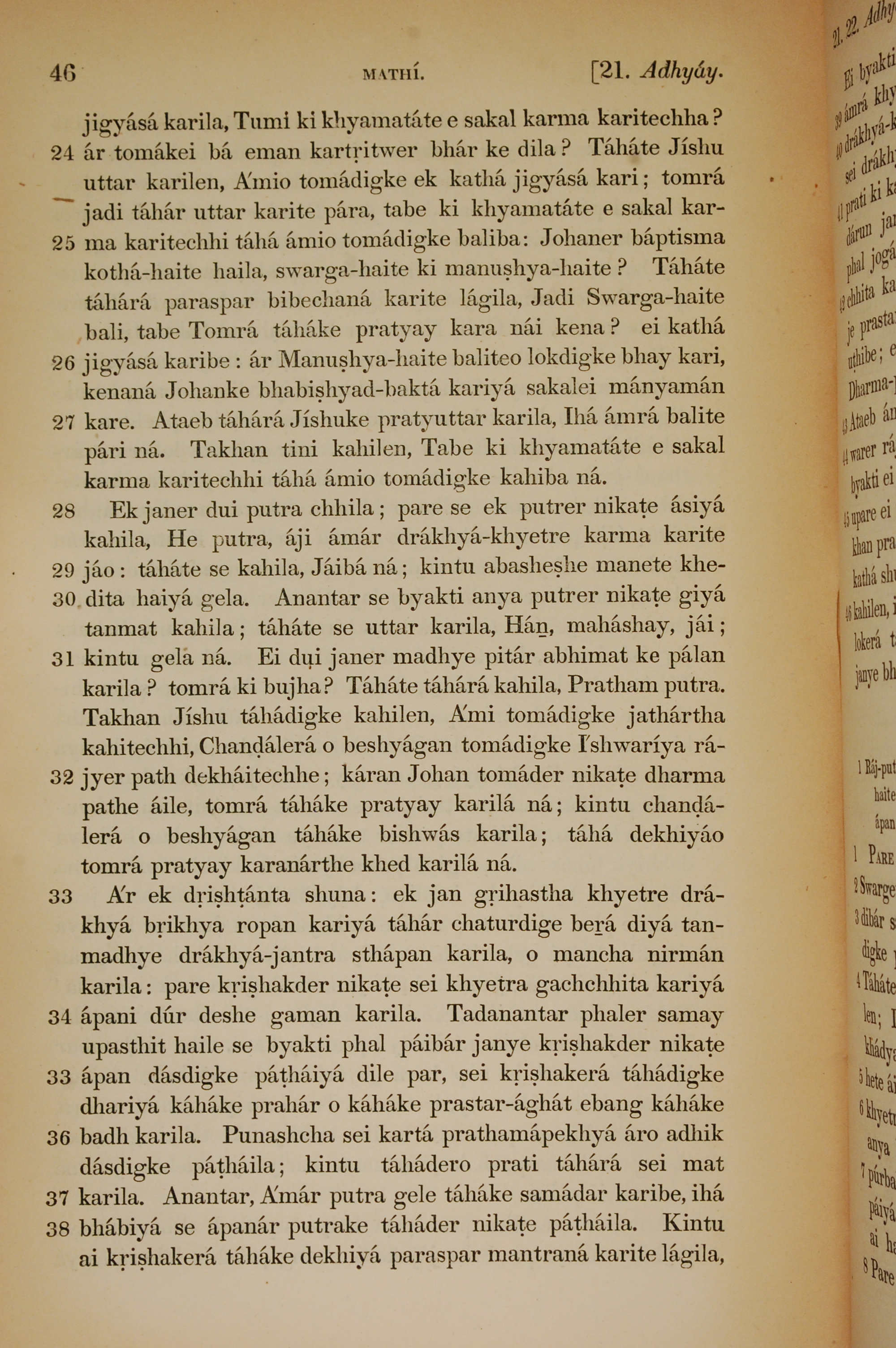 1839年孟加拉語新約全書 馬太福音 21 章 24 節到 21 章 38 節