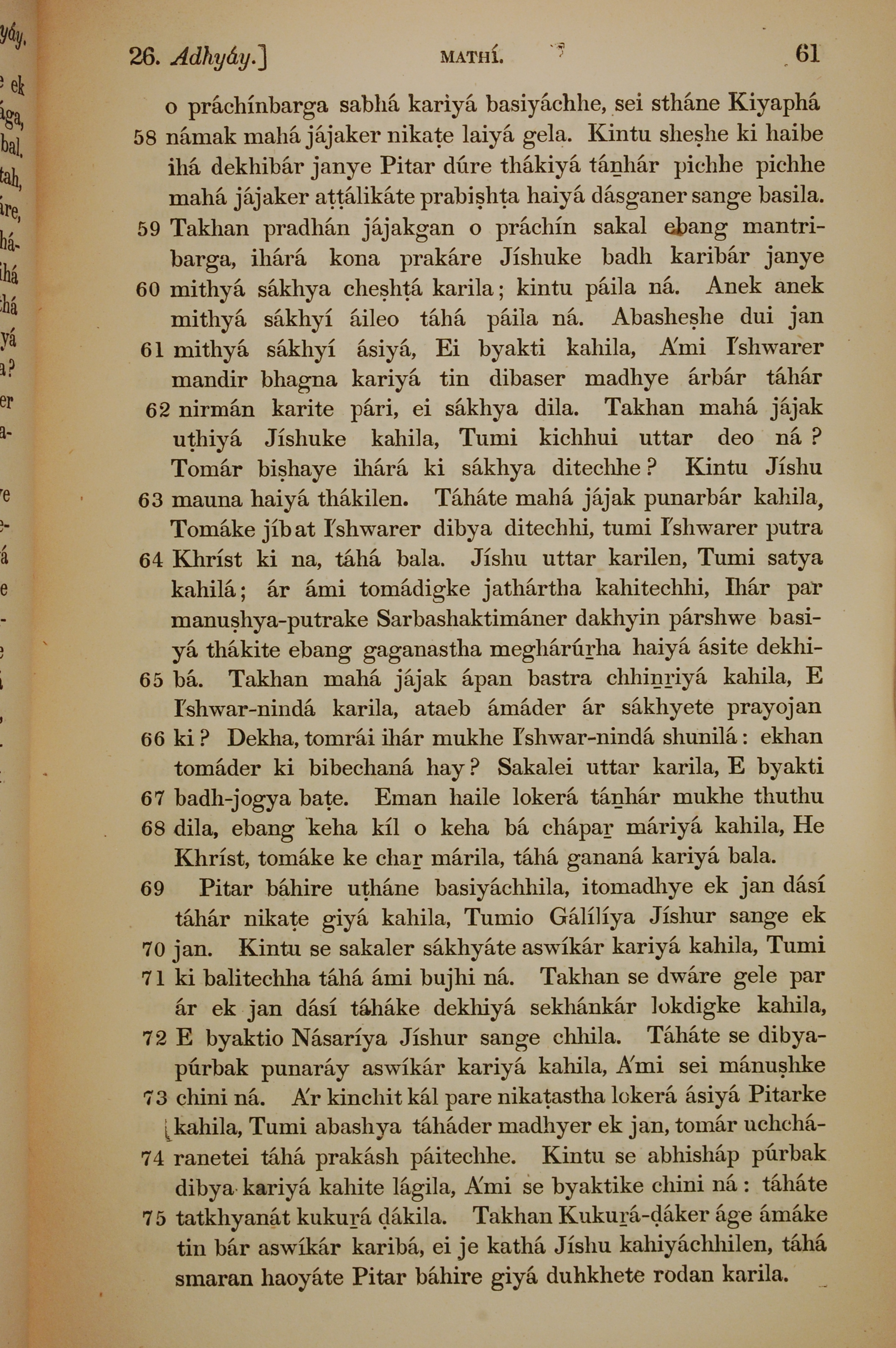 1839年孟加拉語新約全書 馬太福音 26 章 58 節到 26 章 75 節